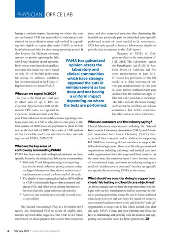 PHYSICIAN OFFICE LAB rates, and also expressed concerns that eliminating the having a uniform impact depending on where the tests bundled rate previously paid on individual tests typically are performed. CMS has responded to widespread critiperformed as part of panel needed to be re-instituted. cism of its data collection scope and method by expandCMS has only agreed to broaden laboratories eligible to ing labs eligible to report data under PAMA to include provide data in response to the GAO report. hospital outreach labs for the coming reporting period. It Reaction to PAMA in Conalso lowered the Medicare payment gress resulted in the introduction of amount to permit reporting by labs PAMA has galvanized H.R. 3584, The Laboratory Access with lower Medicare spend amounts. opinion across the for Beneficiaries Act (LAB) by Rep. Both moves were intended to palliate Scott Peters of California and five concerns that initial cuts were based laboratory and other representatives in June 2019. on only 1% of the labs performing clinical communities If passed, key provisions of this bill lab testing. In addition, legislation which have strongly would be to delay reporting of prihas been introduced in the House of opposed the cuts in vate pay reimbursement by one year Representatives to amend PAMA. reimbursement as too to delay further reimbursement cuts deep and not having and to refine the number and type of What can we expect in 2020? a uniform impact labs that will report data in the future. This year is the third and final year depending on where The bill is in both the house Energy in which cuts of up to 10% are the tests are performed. and Commerce and Ways and Means expected. Approximately half of the committees, but neither committee current CPT codes are expected to has taken action to move it forward. experience reimbursement cuts this year. Data collection between laboratories reporting reimbursement rates to CMS is scheduled to take place in the What are customers and the industry saying? first quarter of 2020 based on payments to them for lab Clinical laboratory organizations including the National tests in the first half of 2019. The results of CMS analysis Independent Laboratory Association (NILA) and Ameriof this data will be used to set rates for the three succeedcan Association for Clinical Chemistry (AACC) have ing years of PAMA, 2021-2023. expressed their concerns and in addition to supporting HR 3584 have encouraged their members to support the bill with their legislators. More than 50 other professional What are the key areas of organizations including pathology and medical care procontroversy surrounding PAMA? vider organizations have also expressed their concern. At PAMA has been met with widespread criticism on three the same time, the customer input I have become aware specific fronts by the clinical and laboratory communities: of has indicated some customers are reducing testing as a ʯ With only 1% of labs performing tests reporting result of “reimbursement concerns” but they are typically data for the initial collection period, concern is that not specifically mentioning PAMA as the reason. the largest laboratories’ data skewed market-based reimbursements toward the lower end of the scale ʯ The depth of cuts estimated as high as $670 million What should we consider doing to support our by CMS is substantially higher than estimated and clients’ lab testing and health care objectives? impact POL and other lower volume laboratories As always, making sure we have the important three-way diafar more than the larger reference laboratories logue with our key manufacturers and key customers is critical to assuring appropriate testing. Be sure to focus on clinical ʯ Access to care reductions, especially in rural areas value, keep your eyes and ears open for signals of concern, is a possibility use customer business reviews wisely and look for “scale up” opportunities to keep costs in line where needed. Stay alert The General Accounting Office, in a November 2018 and agile. PAMA is here, and your planning and focus are report, also challenged CMS to assure all eligible labokeys to maintaining and growing your lab business and supratories reported data, requested that CMS re-set future porting our customer needs for better patient care. rates based on actual payment rates rather than maximum