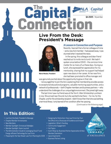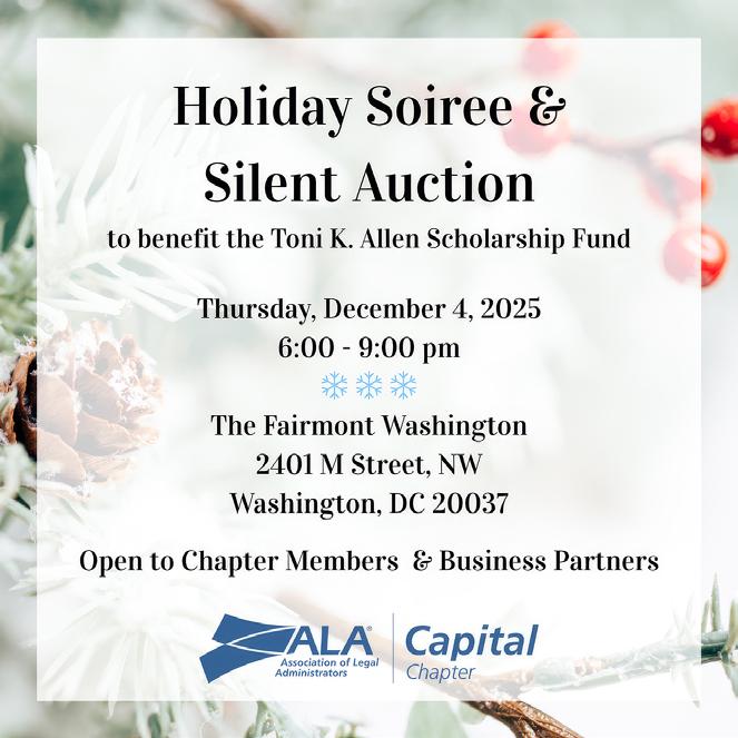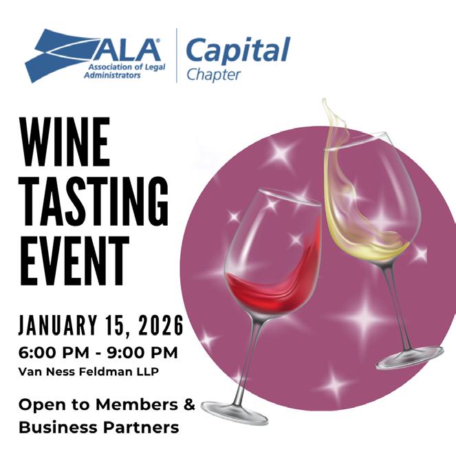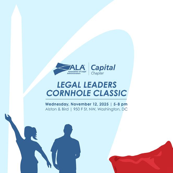 The Capital Connection is published on a quarterly basis for members of the Capital Chapter of the Association of Legal Administrators to provide information for the education and benefit of legal administrators, law office managers, managing partners of law firms, and other law related associations. Capital Connection is not engaged in rendering legal, financial, tax counseling or advice through this publication. The contents of all articles, letters, videos, and advertisements published in Capital Connection should not be considered endorsements by the Capital Chapter of ALA nor the opinion expressed therein of any products advertised. Contributing authors are requested and expected to disclose financial and/or professional interests and affiliations that may influence their writing position. Articles and materials accepted for publication are subject to editing by the editorial team and become property of the Capital Chapter of the Association of Legal Administrators. Links to Capital Connection may not be shared without permission from the Chapter.