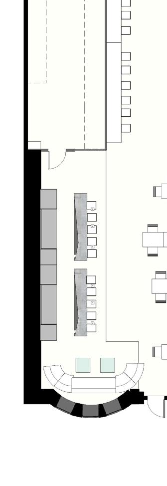 STRUCTURE : FORMING THE VERTICAL STRUCTURE OF THE NORTH WALL ARE A ROW OF 8” WIDE-FLANGE BEAMS; SUPPORTING THE ROOF AT A MORE CENTRAL POINT, ALSO DEFINING THE END OF THE MEZZANINE LEVEL, IS ANOTHER ROW OF 8” WIDE-FLANGE BEAMS. THE SPAN OF THESE TWO COLUMNS IS QUITE TALL, SO FOR TRANSPORTATION OF MEMBERS TO SITE, WE PROPOSE SPLICED COLUMNS.