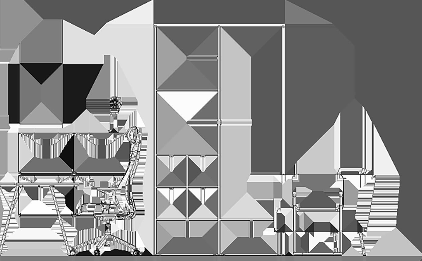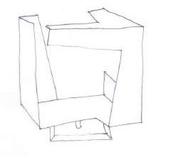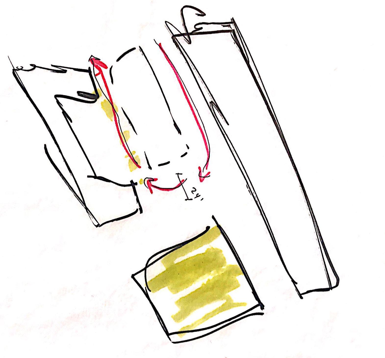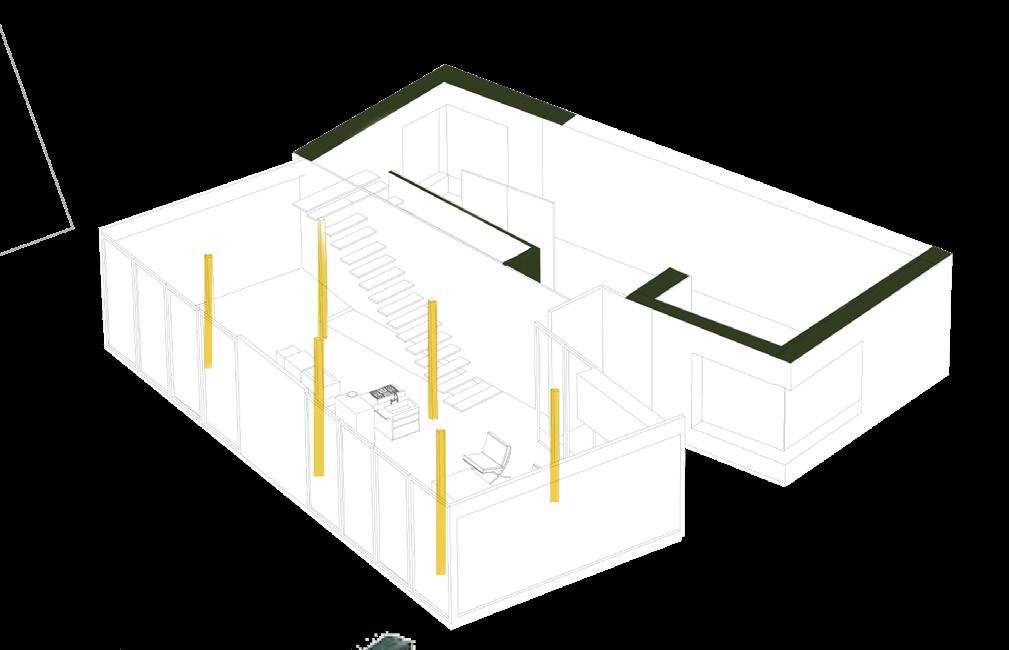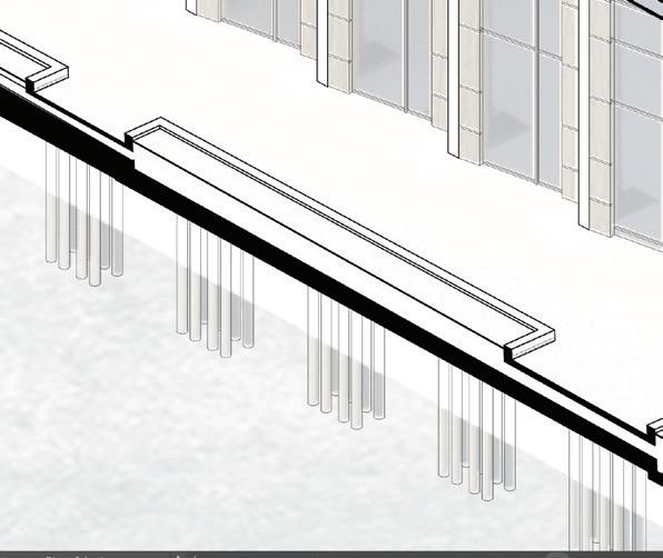 THOSE ARE THE MEMBERS PERPENDICULAR TO THE GROUND PLANE, AND THIS OBTUSE ANGLE FORMED BY THE SLANTED ROOF AND THIS LAST, SHORTEST COLUMN SET. WE OBSERVE THAT THE SLANT OF THIS COLUMN MAY PRODUCE MOMENT AROUND THIS POINT (POINT TO BASE OF SLANTED COLUMN) AND WANTED TO COUNTERACT THAT ROTATION BY TYING IT BACK TO THE MEZZANINE LEVEL. WE CHOSE TO DO THIS RATHER THAN SUPPORT IT EXTERNALLY BOTH FOR SPACE CONSTRAINTS AS WELL AS TO GIVE THE BUILDING A SENSE OF “INTERNAL” AUTONOMY, NOT WISHING TO DETRACT FROM THE SIMPLE ANGULARITY OF THE WHOLE MAIN STRUCTURE. ALONG THIS AXIS (POINT LONGITUDINALLY) THERE IS A SUBTLE CHANGE IN THE ROOF FRAMING ANGLE WITH RESPECT TO THIS POINT (ABOVE SHORT COLUMN) WHICH EXPLAINS THE FANNING IN THE SECTION. LATERAL STABILITY IS PROVIDED BY CROSSED CABLE BRACING AND KNEE BRACING.