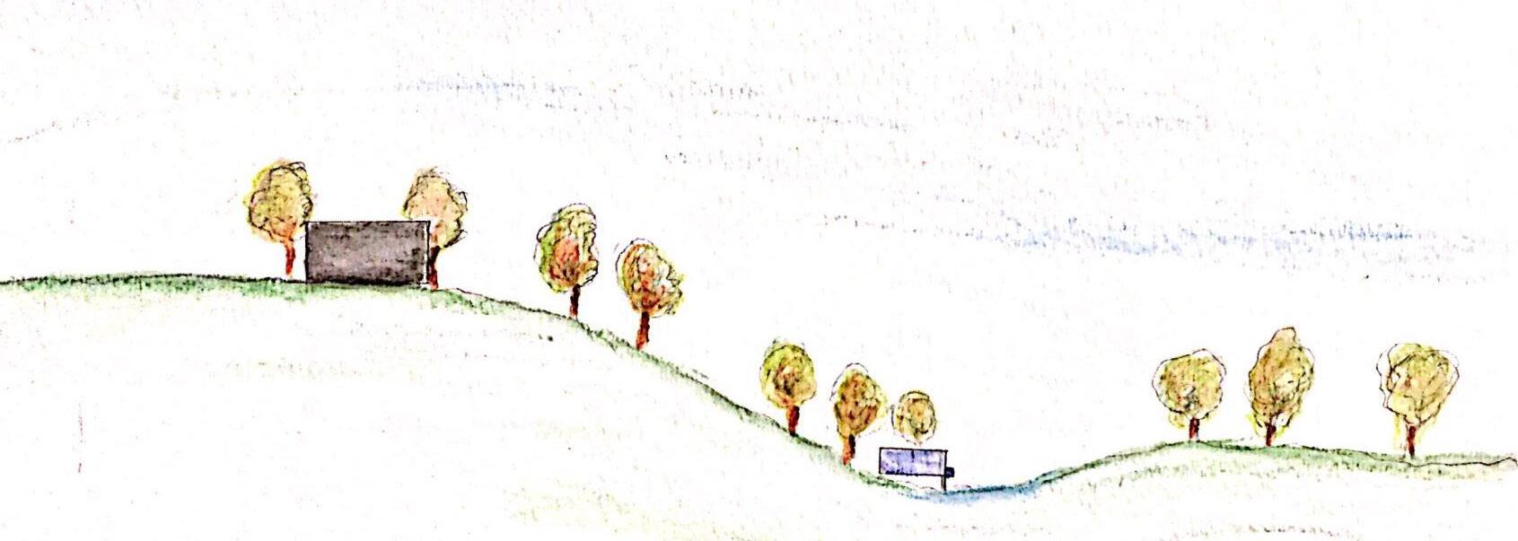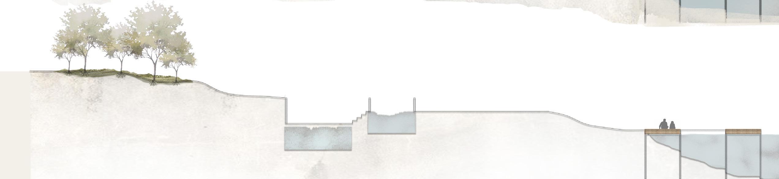 The semi- permeable edges of the small re ected pool collect the surrounding water since the landscape slopes down it directs water to the opening which they pass by then down to the tank