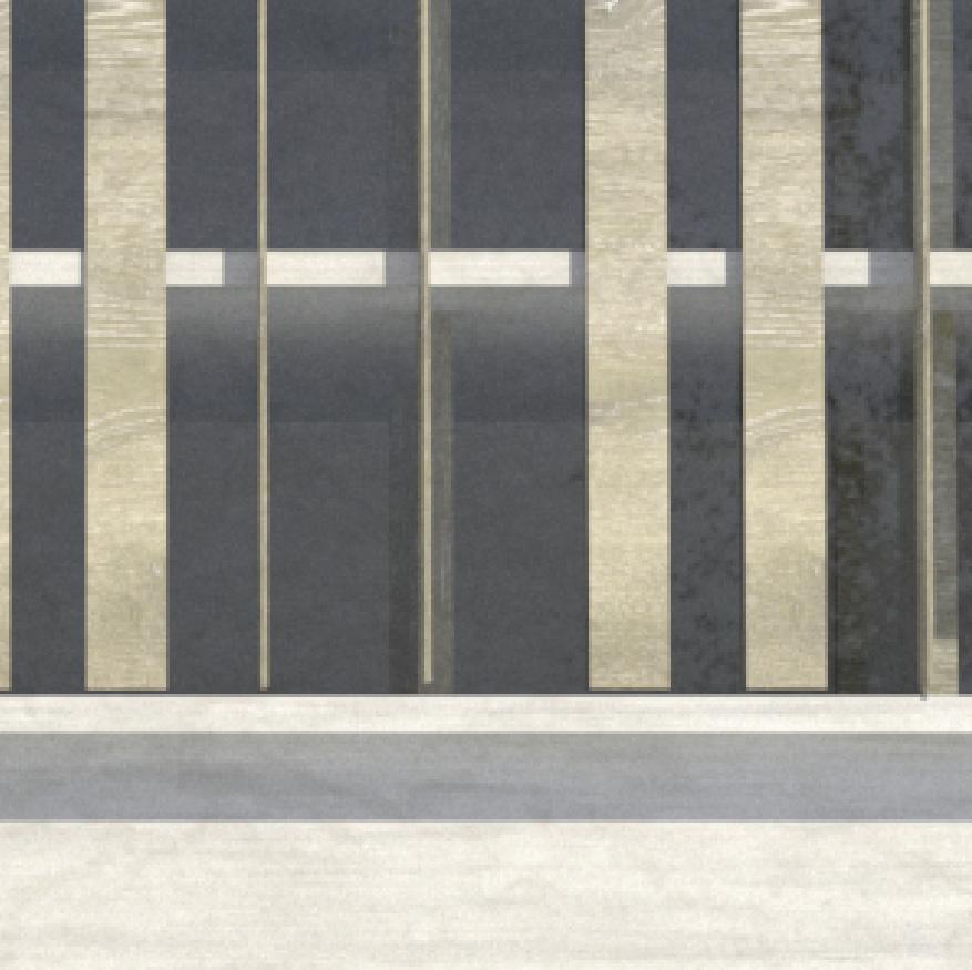 The facade is attached onto the structure with a weld, in between the 2 concrete is an Insulation layer as-well as a thermal barrier layer so the building will avoid heat loss or gain. The horizontal slabs are tilted so the water slides down. The glass is incerted in-between the wood panel then placed into the concrete panel.