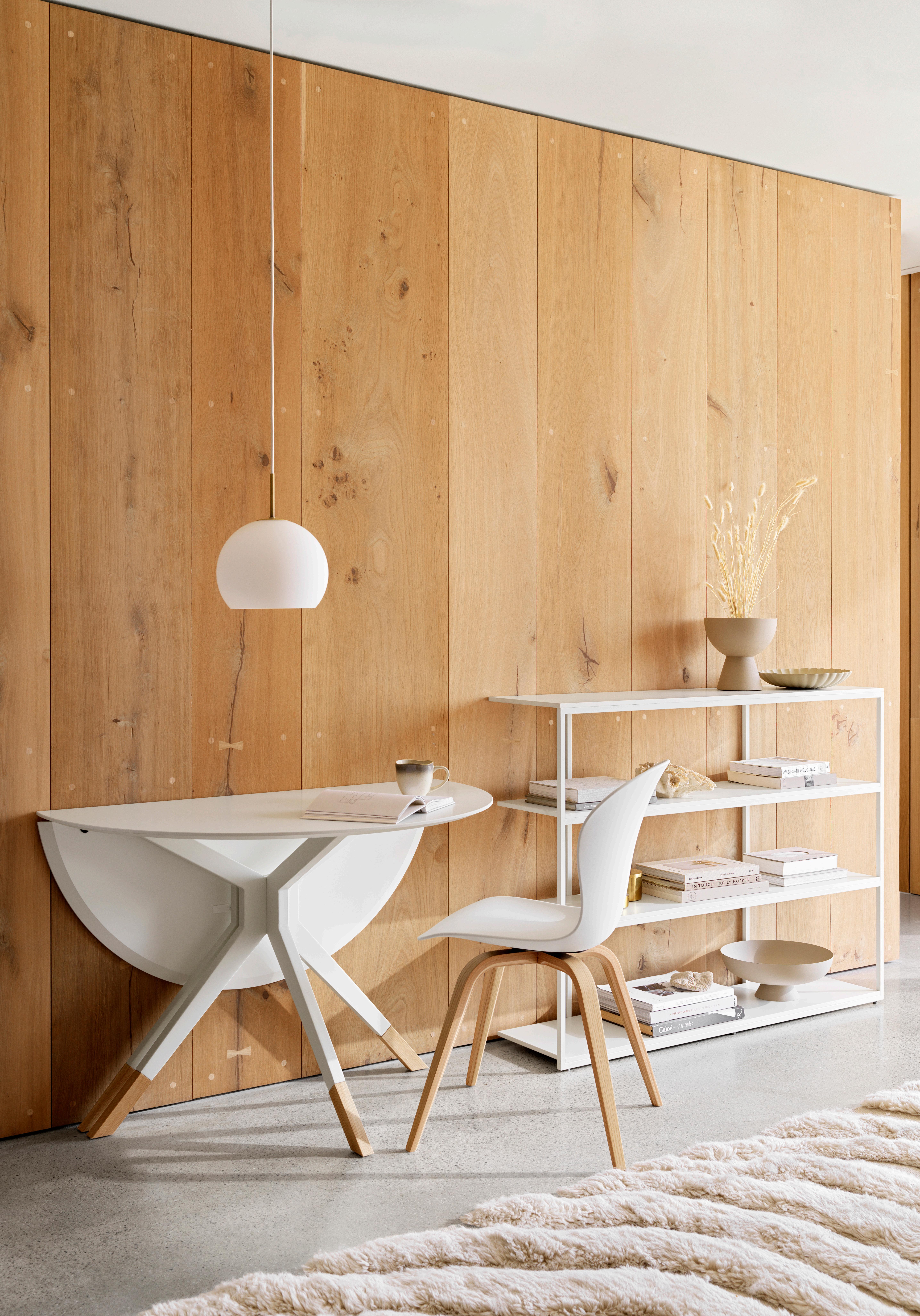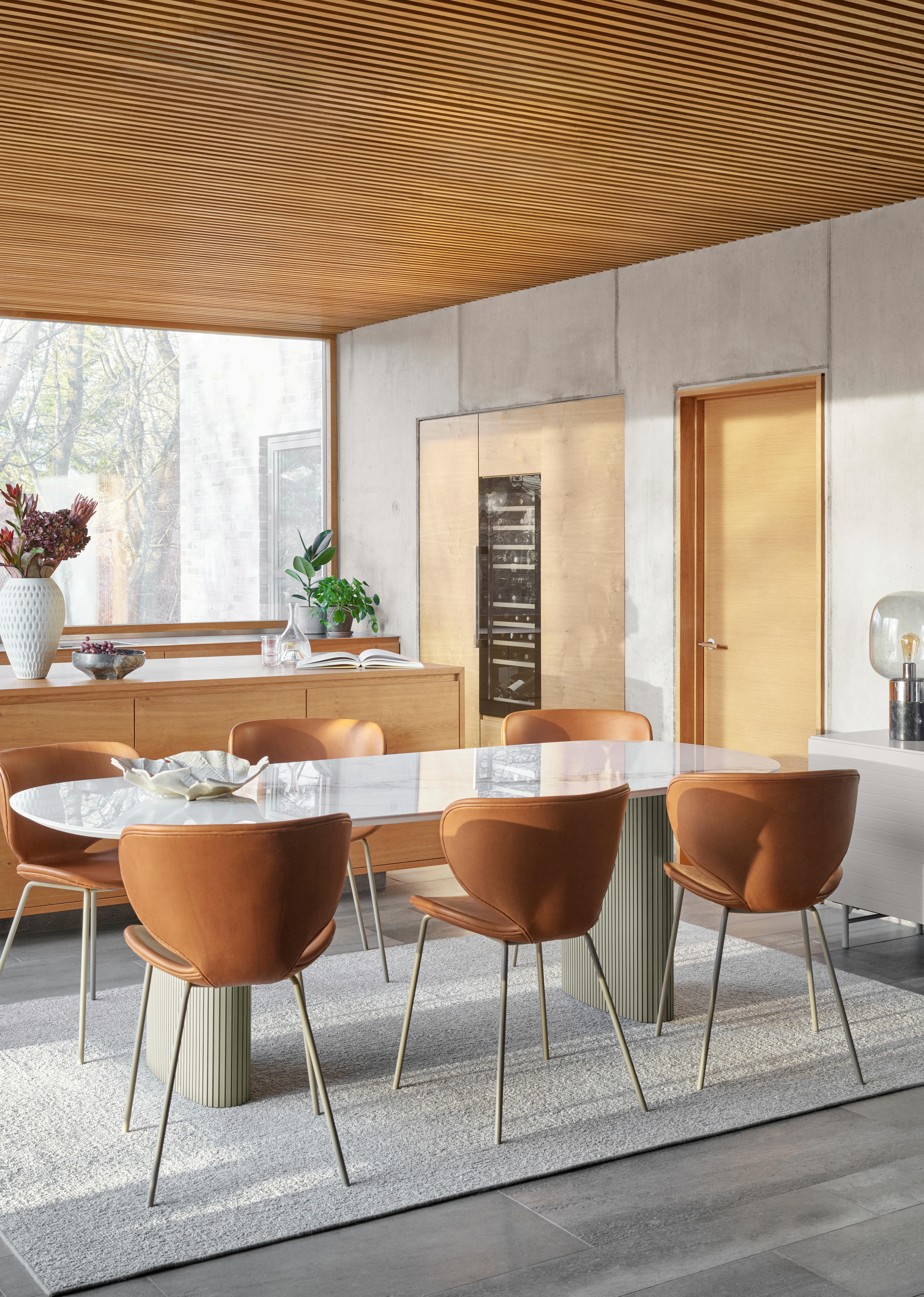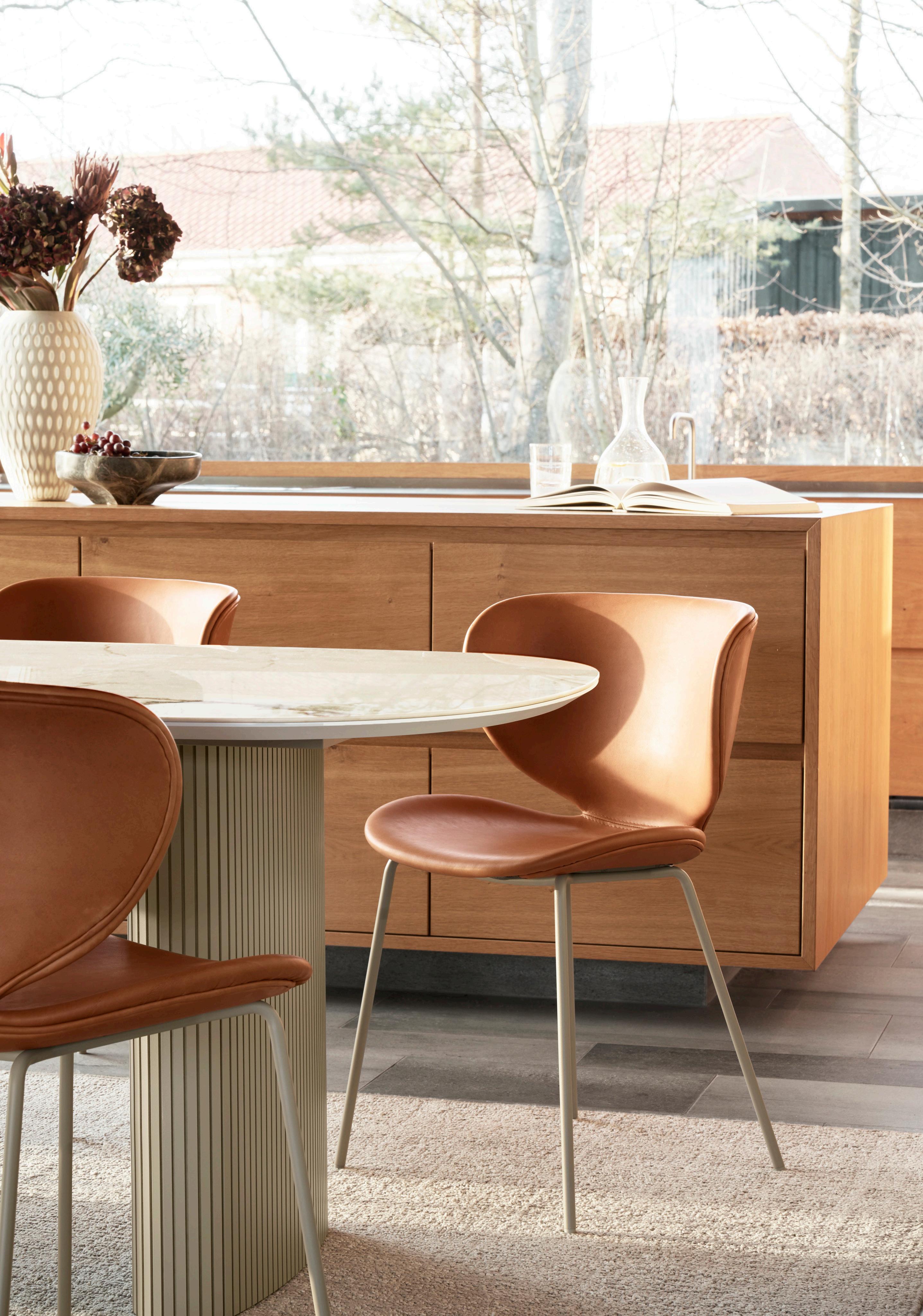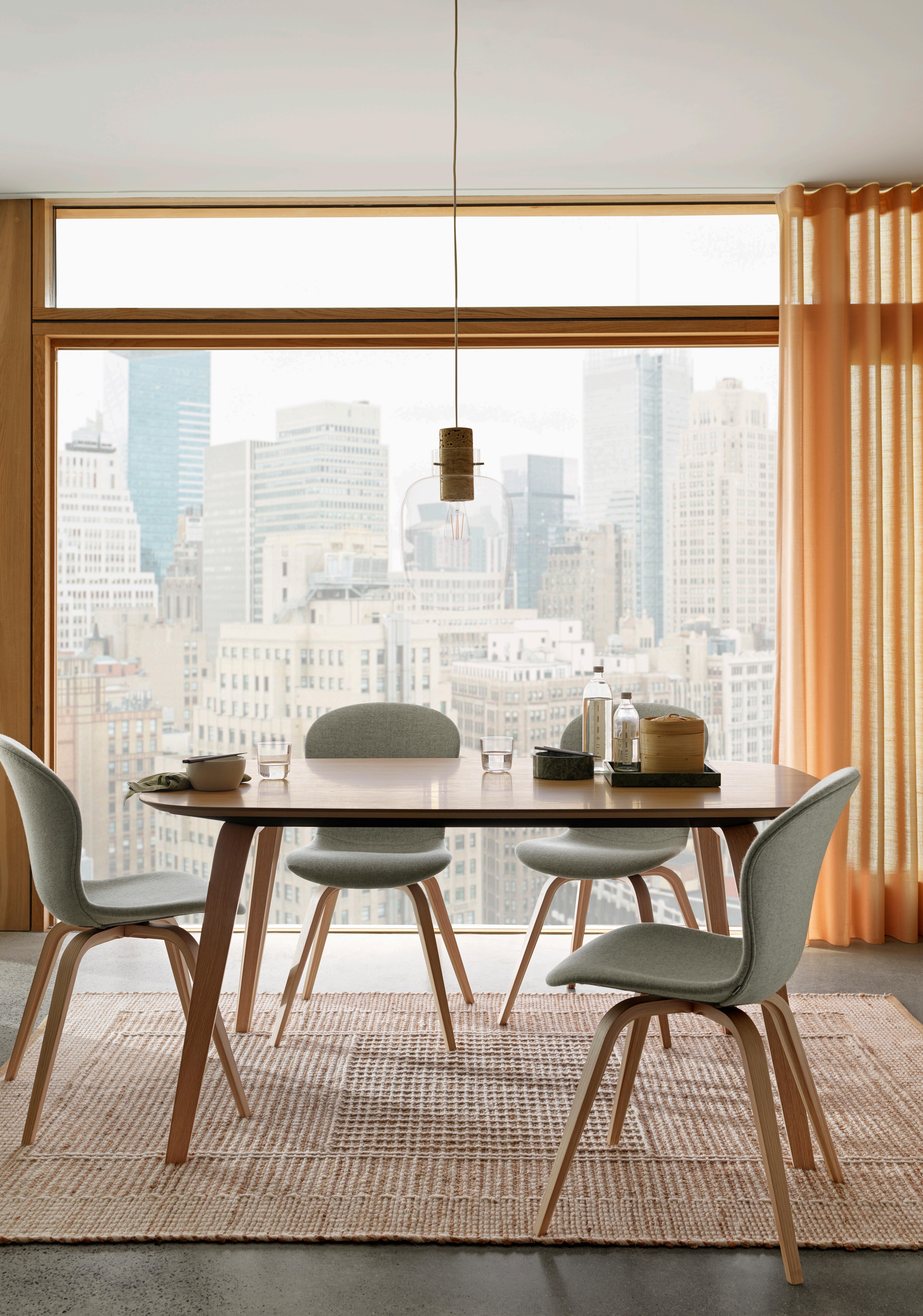 Beautifully balanced with a thin, elegant and timeless look, the Hauge dining table in natural oak with the Hauge chair in Wellington felt masterfully combines Danish functionality and form.