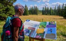 Nachdem Sie die wunderbare Aussicht genossen haben, führt die Tour steil bergab Richtung Auerhahnstraße. Diese führt über den Arberhüttenschachten zur gemütlichen Chamer Hütte, wo eine verdiente Einkehr wartet. Gleich nach der Chamer Hütte erwartet Sie der Bürstlingschachten, an dessen nördlichen Rand wir weiterwandern. Am westlichen Fuß des Kleinen Arbers treffen Sie auf den Fernwanderweg Goldsteig. Die Route führt über die malerische Enzianwiese, ein mittlerweile verbuschter Schachten. Mit dem Enzian und der Heugstatt liegen zwei Gipfel mit atem-