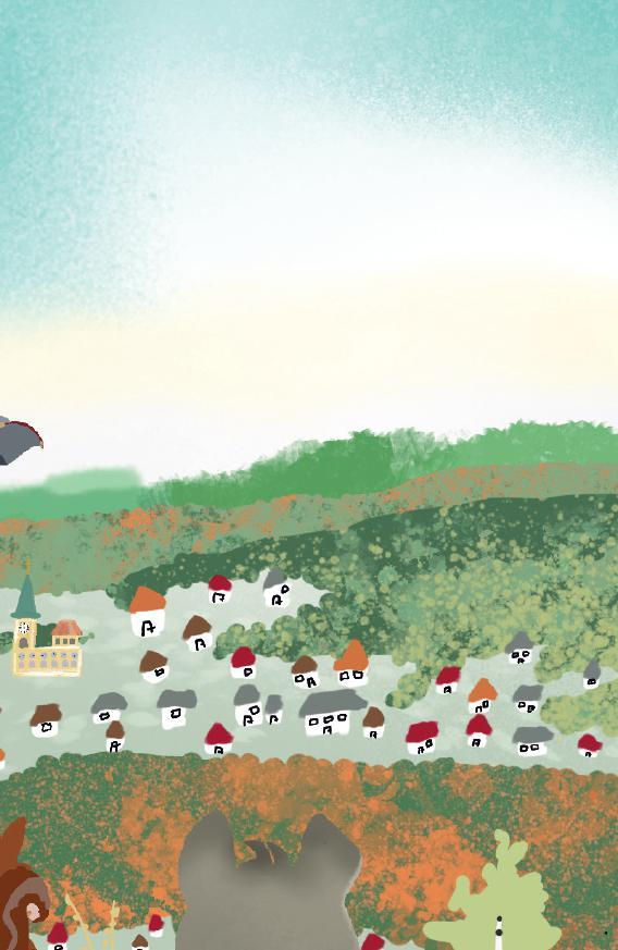 Dankend winken die drei Freunde Falke Fiona zu, die bereits wieder über den Dächern des Waldes schwebt.