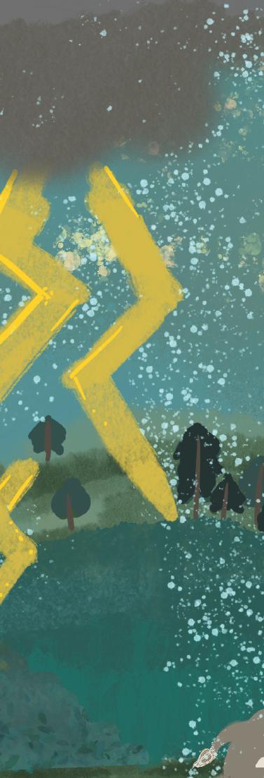 Lautes Donnergrollen erschüttert die Lichtung. Grelle Blitze erhellen die Dunkelheit. Regentropfen, so groß wie Murmeln, prasseln mit lautem Geplätscher zu Boden. „Schnell, wir müssen Unterschlupf suchen!“, ruft Edi, dessen rotbraunes Fell schon pitschnass ist. Die drei Freunde suchen die Waldlichtung nach einem Versteck ab, doch im hohen Gras können sie nichts finden. „Wo… wo sollen wir denn nur hin?“, fragt der verängstigte Willy. Donner und Blitz kommen immer näher. Die Bäume biegen sich gefährlich im Wind. Äste wirbeln wild durch die Luft.
