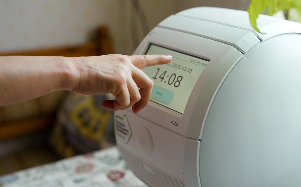 – Klockan 07 på morgonen och 15 på eftermiddagen lyser det en grön knapp. Då trycker jag bara på den, så säger den ”Ta tabletterna med ett glas vatten”. Så det är väldigt enkelt, säger Gerda.