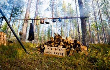 Längre ut i skogen sitter finska kollegan Tommi Tuominen vid en eldgrop. Under elden ligger sex “rövarstekar” av lammlägg på tillag ning i sex timmar.