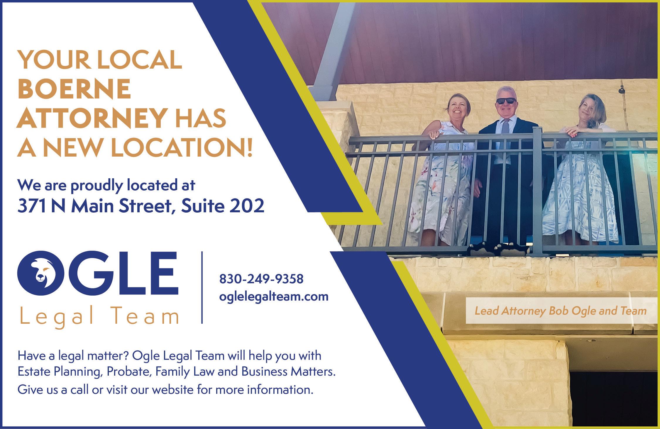 Bob Ogle has been assisting his clients in Boerne and the Hill Country for more than three decades. Bob and his team take pride in the results earned on behalf of their clients, and are a firm you can trust to guide you through the legal system with confidence. They offer Estate Planning, probate, family law and more! Check out their website by going to oglelegalteam.com, give them a call at (830) 429-9358 or visit them on the 2nd floor in the Jefferson Bank Building located at 371 N. Main St., Ste. 202 in Boerne! Congrats again, Ogle Legal Team!