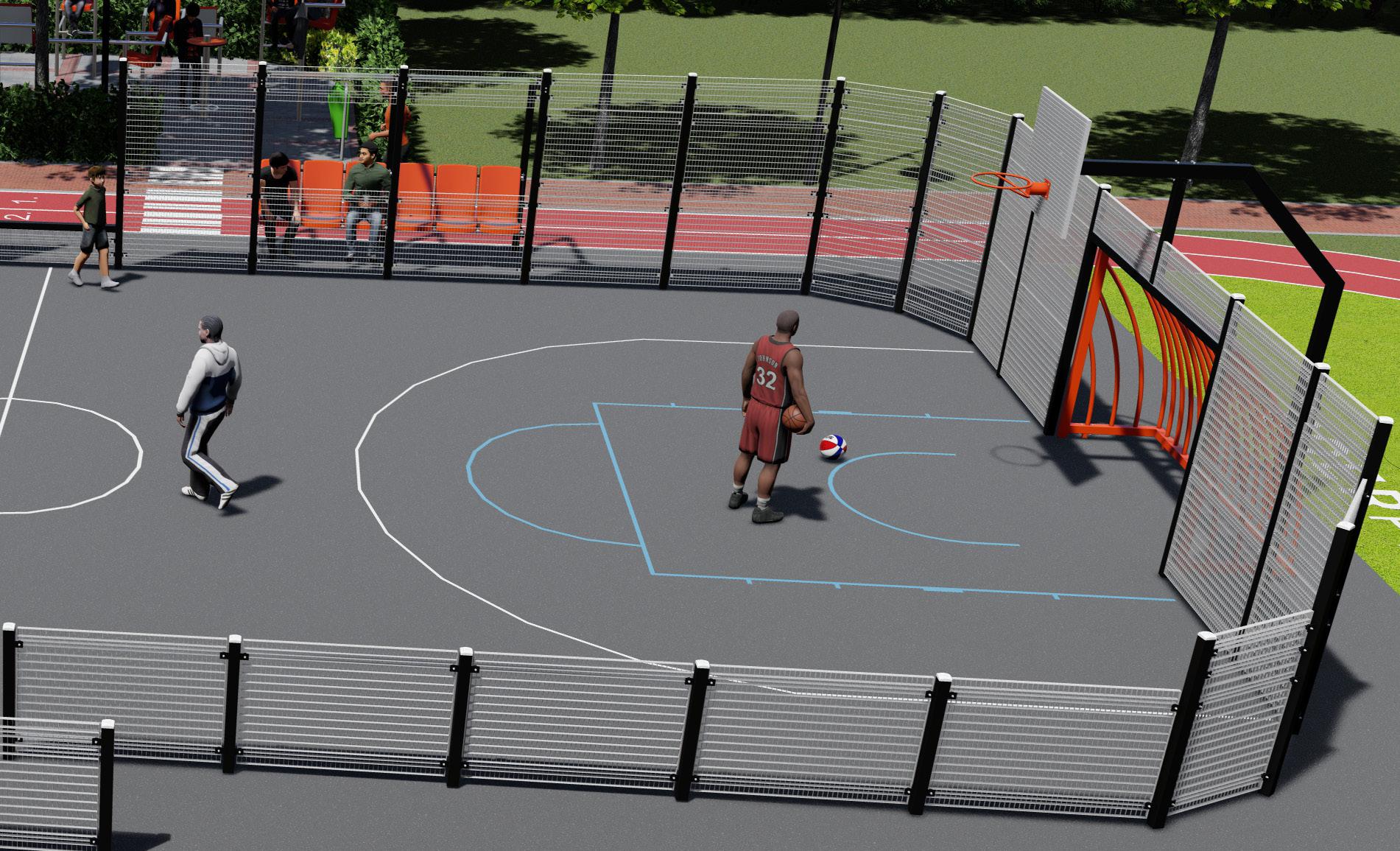 In het bovenstaande ontwerp passen we een duidelijk lijnenspel en heldere kleuren toe om zo verschillende zones te creëren voor diverse soorten gebruikers. Plekken om te ontmoeten, te sporten et cetera. Alles heeft een eigen kleur, ondergrond en visuele of materiële afscheiding. Wij passen ‘speech bubbles’ op een ludieke en heldere manier toe om te communiceren wat er van de gebruikers wordt verwacht. Zo weet iedereen waar hij aan toe is.