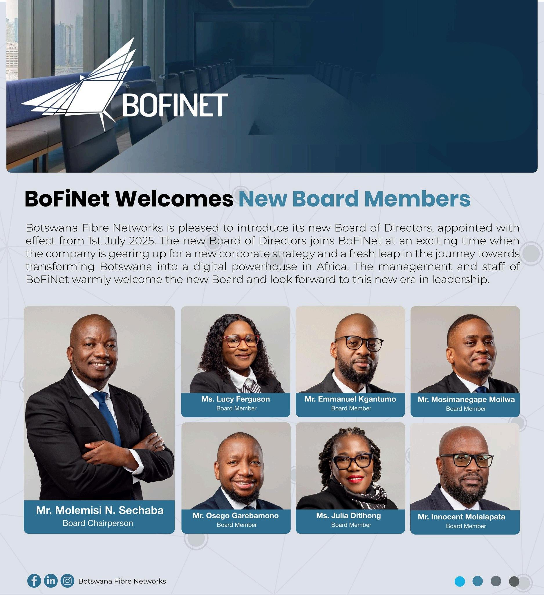 I Welcome to another issue of our quarterly e-newsletter. In this issue, we are excited to introduce our new Board of Directors as appointed by the Minister of Communications and Innovation, Hon. David Tshere The appointment of the new Board takes effect from the 1st of July, 2025. As BoFiNet, we are excited about this leadership renewal, which coincides with a period when BoFiNet will be charting a new corporate strategy to guide the direction of the company for the next five (5) years