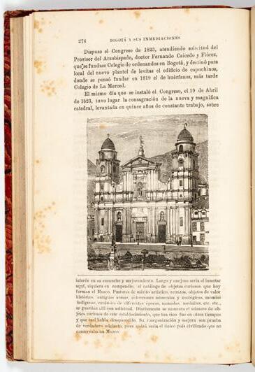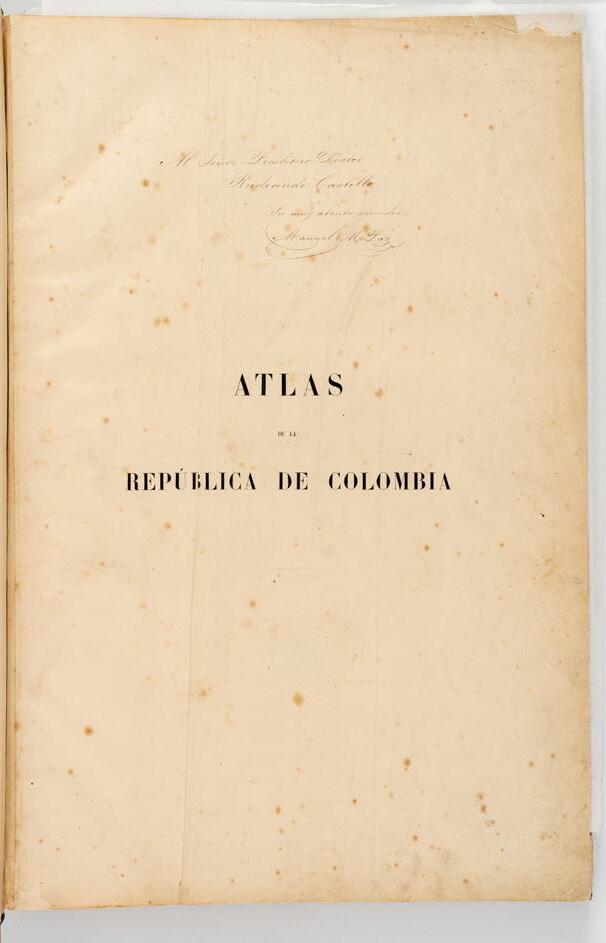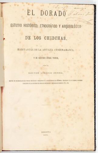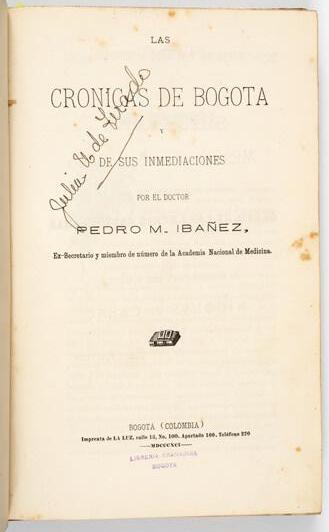 Daza y dedicatoria de María Cristina Cifuentes a Charles Wiener. El tomo 1 contiene notas periodísticas pegadas en guardas, relacionadas con el libro.
