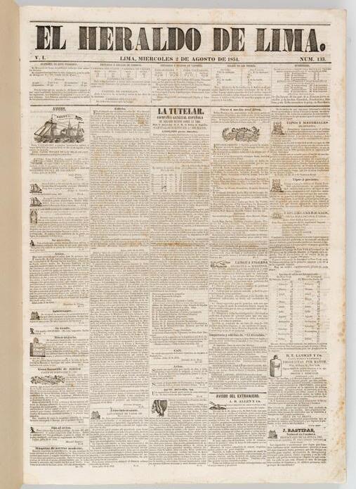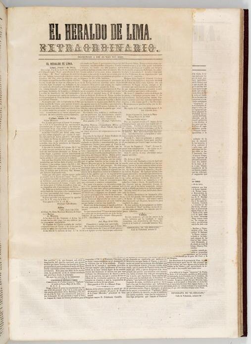 Dos años de publicación del Heraldo de Lima (1854-1855), reunidos en dos volúmenes. El Heraldo fue publicado en los talleres tipográficos de Juan Martín Larrañaga. Circuló durante el periodo de transición política posterior a la caída del régimen de José Rufino Echenique. Entre sus colaboradores más destacados se cuentan intelectuales y políticos de la época como Bartolomé Herrera, Francisco de Paula González Vigil y José Gálvez Egúsquiza. Contiene, en el volumen 1, los números 1 (15 de febrero de 1854) al 131 (31 de julio de 1854); y en el volumen 2, los números 133 (2 de agosto de 1854) al 261 (4 de enero de 1855), con excepción de los números 129, 131, 186, 190, 216 y 258 (solo se conserva el ejemplar extraordinario), así como el número 260.