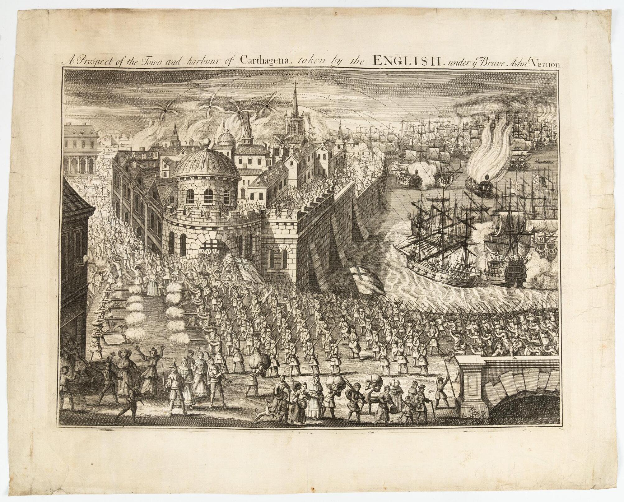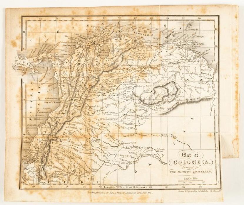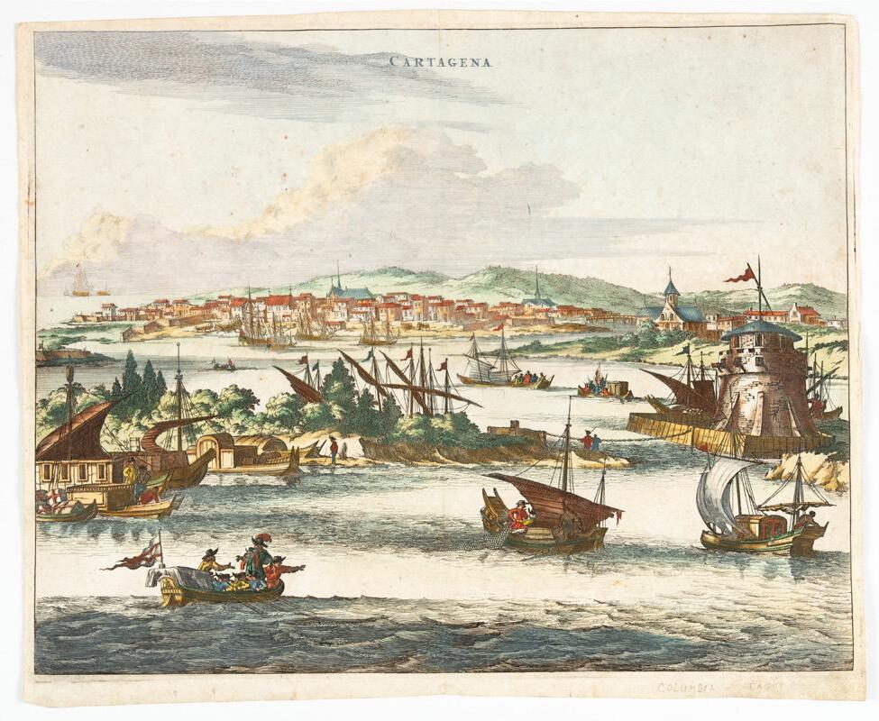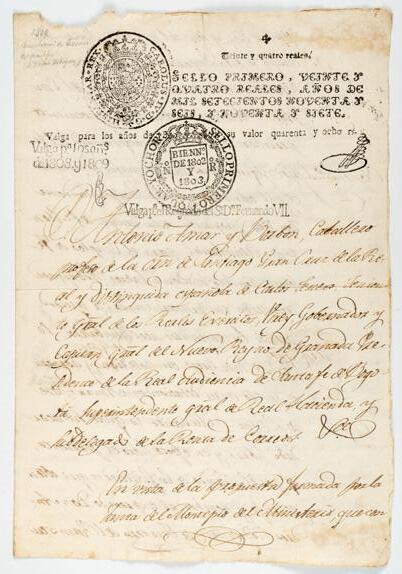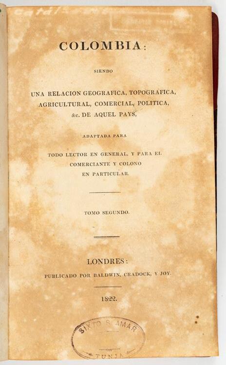 El Almanak Mercantil o Guía de Comerciantes para el año 1802, impreso en Madrid, con encuadernación de época, fue mucho más que un simple repertorio de datos: representaba una brújula indispensable para el comercio y la administración del Imperio español. Concebido como un directorio práctico, reunía aranceles, rutas postales, equivalencias monetarias, nóminas de mercaderes y calendarios de ferias, consolidando en un solo volumen la información necesaria para planificar negocios y orientar decisiones económicas. Su público eran comerciantes, fabricantes y funcionarios, pero también ilustrados interesados en conocer la dinámica de los mercados y las riquezas coloniales. En esta edición, la Plaza de Cartagena en el Nuevo Reino de Granada ocupa un lugar privilegiado: se describen sus abundantes recursos minerales (oro, plata, perlas, esmeraldas, cobre, plomo y azufre), junto con productos agrícolas y comerciales como algodón, azúcar, añil, cacao, maderas y ganados. El texto incluso resalta una curiosa planta, la “yerba Bogotá”, semejante al té de China y alabada como eficaz antídoto contra la mordedura de culebra. Este tipo de referencias, a medio camino entre la estadística económica y el asombro naturalista, revelan la riqueza material y simbólica de territorios como Cartagena y muestran la función de estas guías como espejos de un imperio que buscaba ordenar, catalogar y aprovechar sus posesiones ultramarinas. Incluye al final un capítulo dedicado a América (Havana, Veracruz, México, Guatemala, Cartagena, Buenos Aires, Montevideo, Guadalajara, Chile, Caracas) con listados de cargos relacionados con la vida económica y sus encargados. Ejemplar muy raro. Sin registro en RBH. Solo un ejemplar en WorldCat/OCLC (Madrid). Palau 7538. Buen estado general. Presenta rayones con tinta rosada en varias hojas. 1 pieza.
