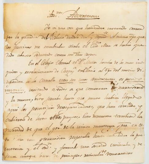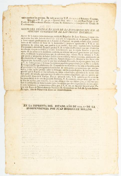 Este folleto de 17 páginas, publicado en Caracas en 1837, contiene el relato en el que José Antonio Páez expone su trayectoria política y militar, así como una síntesis de la historia de Venezuela desde los inicios de la independencia hasta ese año. En particular defiende su papel en la disolución de la República de Colombia (Gran Colombia). Nuestro ejemplar se encuentra completo, con su portada original, adornado con un marco ornamental y un florero en su centro.