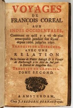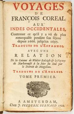 Lote 124. Voyages de François Coreal aux Indes Occidentales contenant ce qu'il y a vû de plus remarquable pendant son séjour depuis 1666 jusqu'en 1697. [Coreal, Francisco], 1722. Detalle.