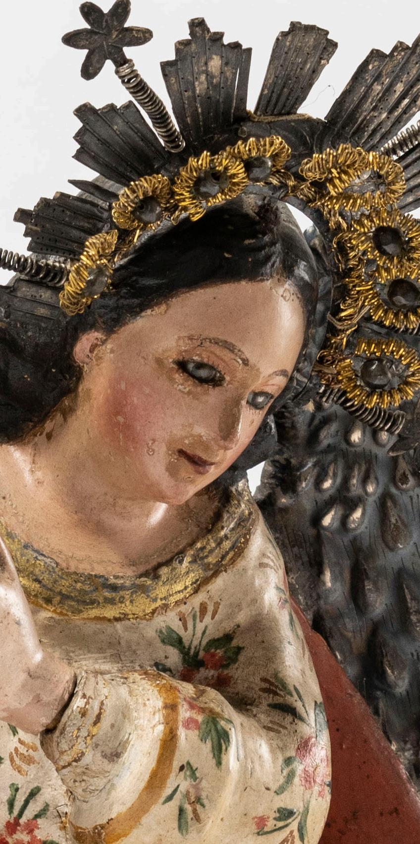 Faltantes en los dedos de las manos y en el píe. Faltantes pictóricos que no afectan la estética de la pieza. Procedencia