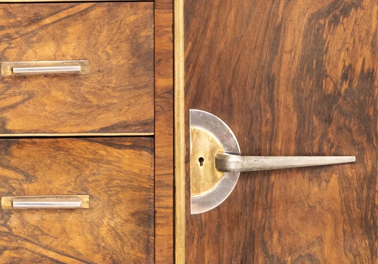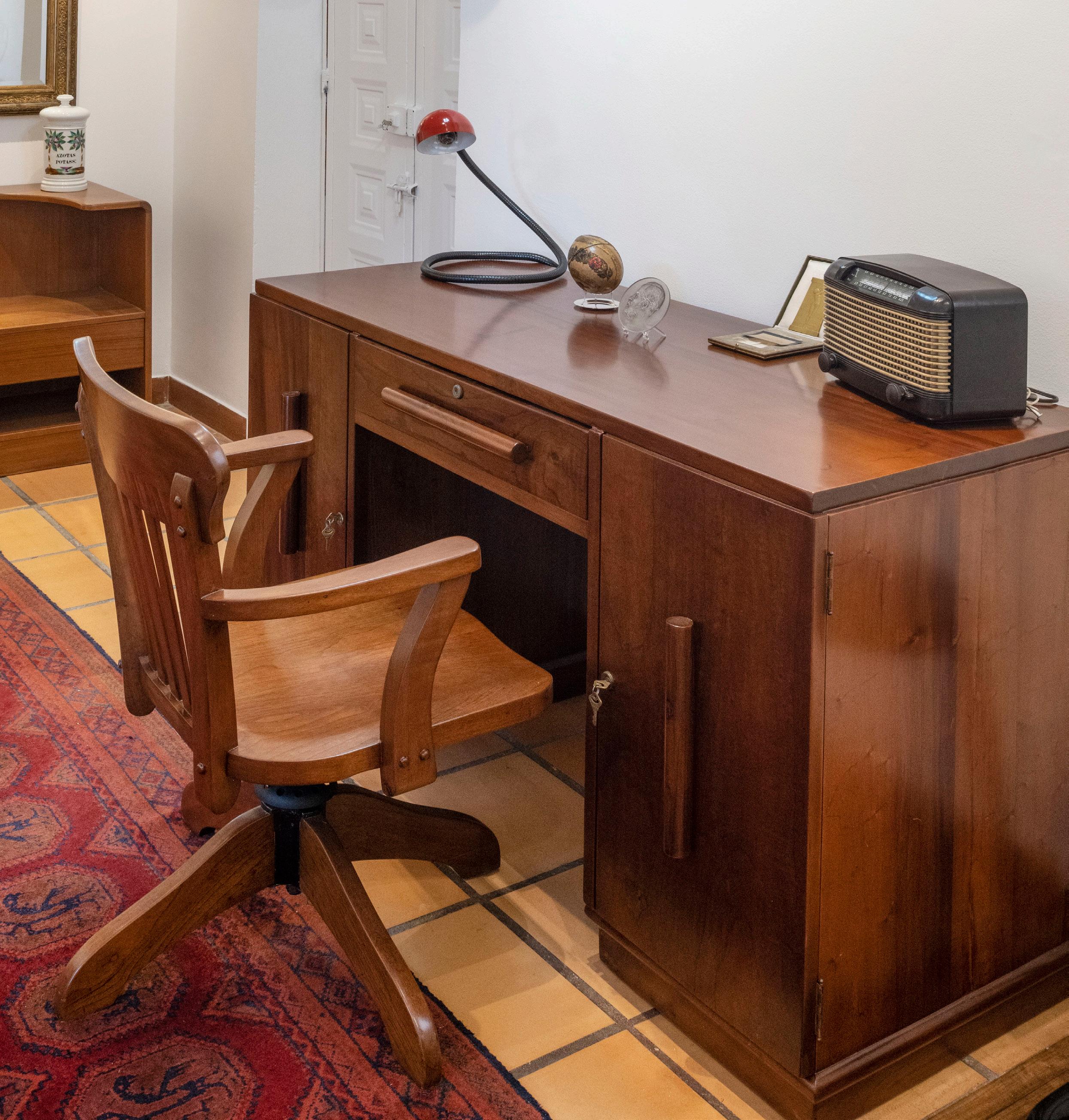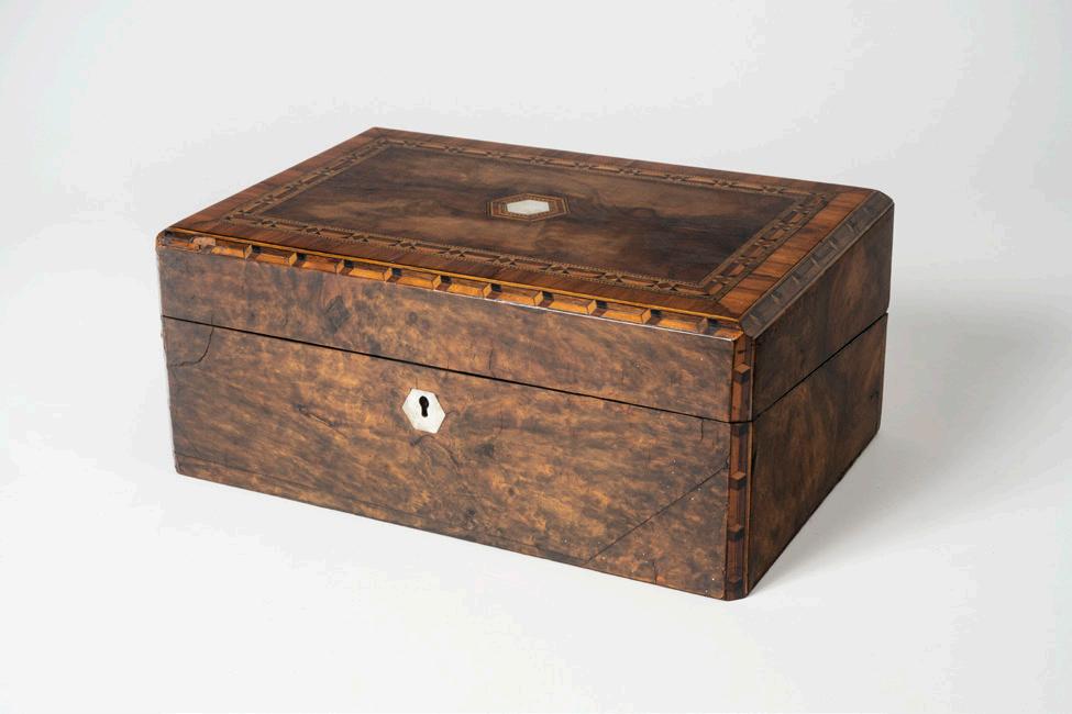 Seis compartimentos internos, uno de ellos con seguro. Solapa tapizada, dos tinteros, porta plumas y cerradura.