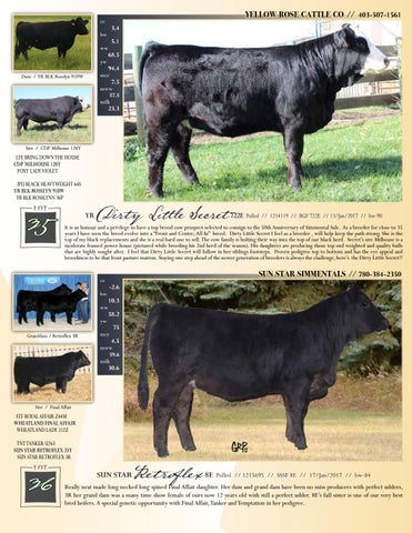 It is an honour and a privilege to have a top brood cow prospect selected to consign to the 50th Anniversary of Simmental Sale. As a breeder for close to 35 years I have seen the breed evolve into a “Front and Centre; All In” breed. Dirty Little Secret I feel as a breeder , will help keep the path strong. She is the top of my black replacements and she is a real hard one to sell. The cow family is bolting their way into the top of our black herd. Secret’s sire Milhouse is a moderate framed power house (pictured while breeding his 2nd herd of the season). His daughters are producing those top end weighted and quality bulls that are highly sought after. I feel that Dirty Little Secret will follow in her siblings footsteps. Proven pedigree top to bottom and has the eye appeal and broodiness to be that front pasture matron. Staying one step ahead of the newer generation of breeders is always the challenge, here’s the Dirty Little Secret!!