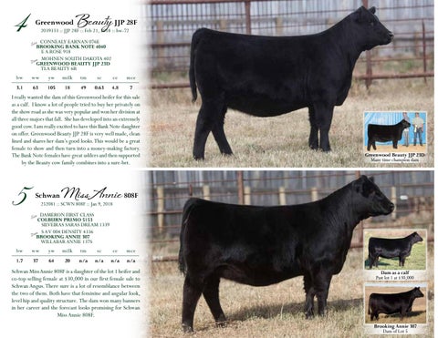 Schwan Miss Annie 808F is a daughter of the lot 1 heifer and co-top selling female at $30,000 in our first female sale to Schwan Angus. There sure is a lot of resemblance between the two of them. Both have that feminine and angular look, level hip and quality structure. The dam won many banners in her career and the forecast looks promising for Schwan Miss Annie 808F.