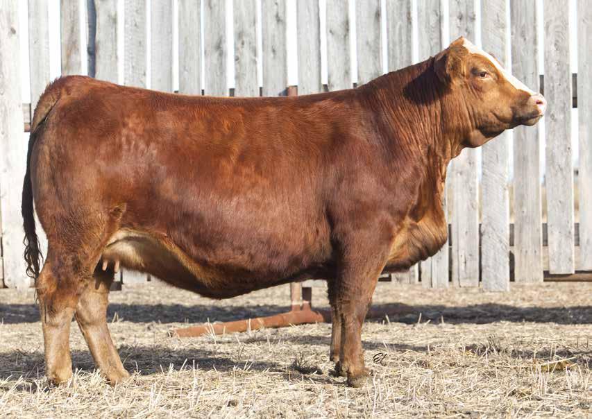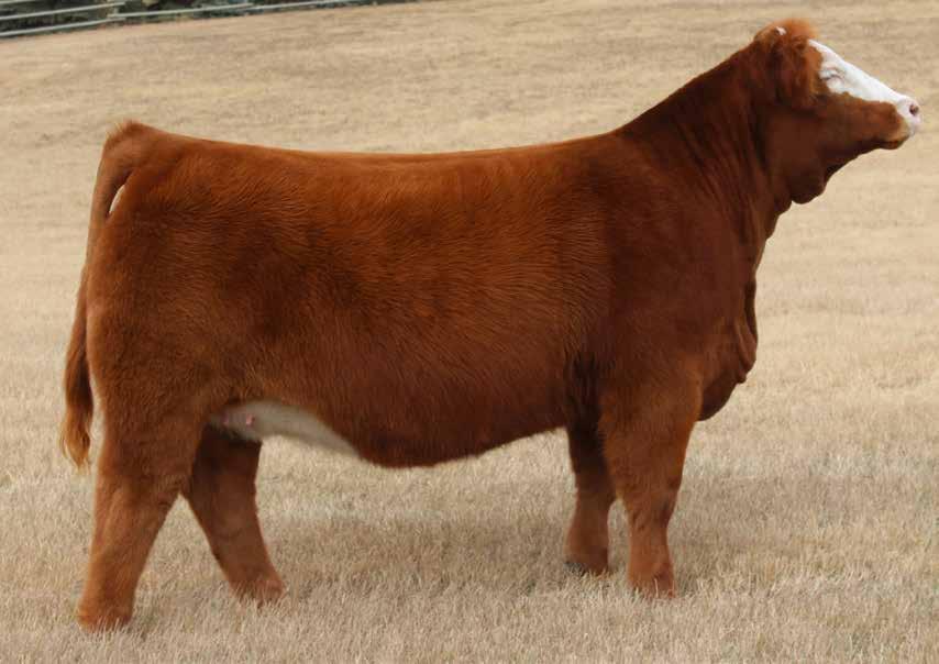 A very special female here! We absolutely love our Rancher females and when you analyze 24M you will understand why. They are exactly where we want to be and we are never going to have too many of his kind. The performance, length, femininity, thickness, volume, udder quality, soundness and foot structure are all to be admired in the Rancher daughters and 24M excels in them all. She has been a favorite her whole life. Her mother is a dark red, big ribbed female with a great udder. 68F has been really productive, she has a son at Siroski Simmentals as well as many top commercial programs. 24M is bred early to Slider, proven calving ease and added quality is what he brings to the table. His ability to calve these performance females is as good as it gets. A highly marketable calf will be the result of this mating.