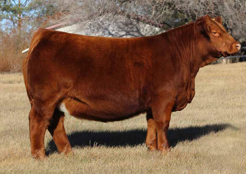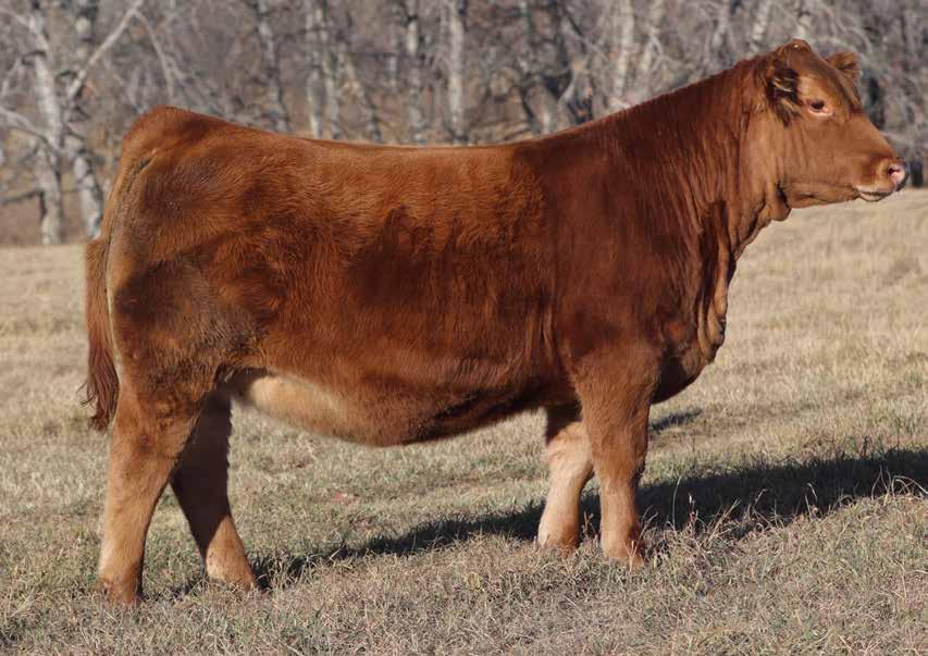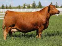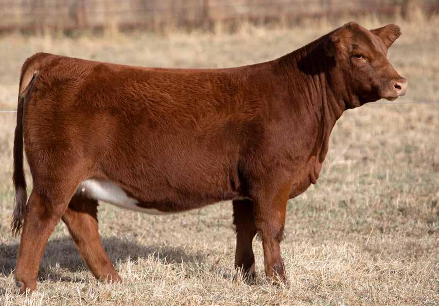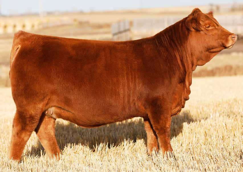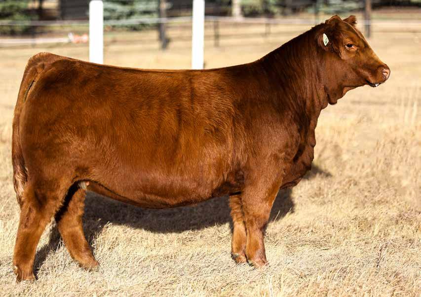 Her is a really cool combination pedigree wise combined with her dark red colour, exceptional muscle mass, and exceptional power. This darling has been a favorite since she was born and i am honoured to be able to showcase her at the prestigous friday night lights sale. Her mother came right out of this sale a few years back and has turned into a beautiful female and has passed those qualities onto her daughter. This calf will be admired for her spring of rib, hip, muscle shape and power with beautiful udder development and teat placement all while showcasing a feminine attractive look. A stacked pedigree with Darlin, Tycoon, Stratton, and High Roller this fall born female has the extra age size and the appeal to catch anyones eye. Homo polled by parentage.