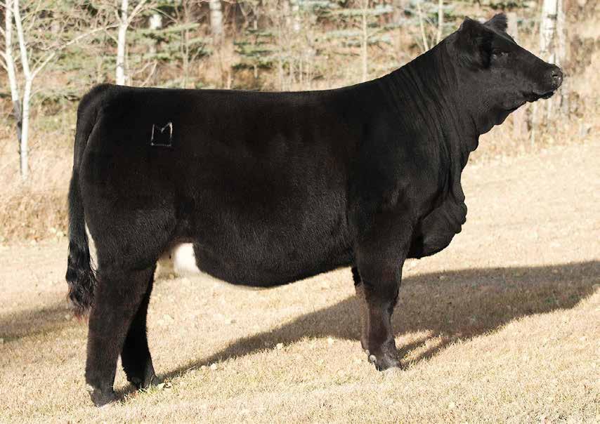 A ¾ blood female coming from the heart of our operation. Her dam is a past FNL graduate selling to Scott Dickson, she came home to calve and brought this beauty to the table in her first go. Slider really has proven his worth as a calving ease bull and now the daughters in production are sound structured, big middled, milky females and those features have all transferred down to 1M. The udder she is laying down is level and even. With Scuba and Bravo teaming up on her bottom side 1M has all the proof to be as long lasting as they come and will do it with ease.