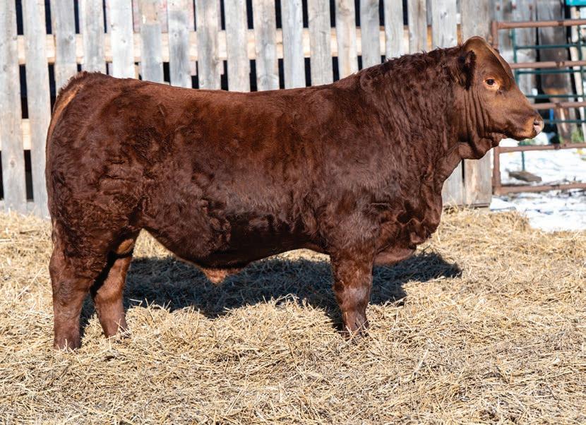 Nashville is a dark red bull that will calve like a dream. Mothered by one of our coveted Gold Key daughters, she has done excellent job on this March calf. She had a set of twins as a heifer that set her 2025 calving date back a little but she is due to calve in January 2026. Nashville impressed some visitors on summer tours and has exceeded our expectations for such a young age. I would keep this guy on your short list if you are in the market for a dark red calving ease specialist. I would plan to retain his daughters as well.