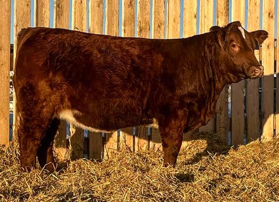 Who would have thought we would have 1 let alone 2 solid red bulls in the sale? Solid Red is something we are focusing on with our red gene carriers to build a herd of them with the 421 bull being a result. Hes smooth shouldered and built to calve cows that will throw nice cherry red calves.