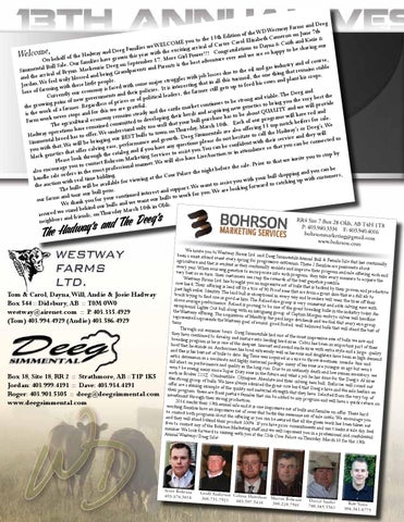 We invite you to We been a must attend eve stway Far ms Ltd. and Deeg Simmenta ls Annual Bull & Fem ale Sale that has contin agriculture and that nt every spring for progressive cattlema is n. ually every year. When sou evident as they continually escalate and im These 2 families are passionate about rcing genetics to inc pro ve their program and sal orporate into each pro very best so in turn, e offering eac their customers can reap the rewards of gram, they take every measure to acquir h and Westway Far ms Ltd the e the cow herd. Their offeri . has brought you an impressive set of bulbest genetics possible. ng is lead off by a trio ls tha t is bac ked by the past high seller, Identi ty. The lead bull is exc of 90 Proof sons that are from a great dam ir proven and productive truck trying to find that is a full sib to one as good as him. Th eptional in every way and breeders will we above average perfor e mance, Reload is pro Reload sire group is very consistent and ar the tires off their ving to be one of the exceptional Lights Ou adds calving ease with gre t the Westway offering. bull along with an intriguing group of Ca at breeding bulls in the industry today. An The acquisition of Mi pta in Mo rgan embryo represented represent nd s the Westway goal of trip has paid large dividends and we fee calves will headline time. l that every sire group sound, good footed, well balanced bulls tha t will stand the test of Through our summe r tou rs, De eg Sim they have continued me to develop and matur ntals had one of the most impressive set e into leading herd sire breeding program as s of bulls we saw and he hoof that he stands on is one of the deepest, hairiest and sound s. Cobra has been an important par t of the . Anchorman has bre ma ir de sire s wi th extra and this is his best set d of bulls to date. Big Timextremely well as his sons and daughters style and a large, quality extra dimension in a hav e e wa bee s n in high dem acquired as a mo fall short on performa derate and highly maternal package; ma sire to throw stoutness, muscle, hair and and ny nce and quality in the won’t be seeing many long run. Due to an of his sons are younger in age but won’t more Super Duty son untimely death and low such as Broker 221Z semen inventory, we , Combustible, Olym s in the future and what a job he has do ne pia this strong group of bulls. We have always n, Absolute and their calving ease bull, for the Deeg’s. AI sires Enfor adm offer are a shining exa mple of the quality and ired the great cow herd that Deeg’s hav cer will round out their program, these e are front pasture fem maternal strength that they have. Select and the sale heifers on investment through ales that can be added ed from the very top their strong producti of to any pro gra m and will have a qu on. 2016 marks their 13 ick return on th annual sale and it working families hav is on e impressive set of bul e an ls and females on off to contact both progra impressive set of cows that backs this er. These hard aw and they will stand behms about the offering as you can be assure esome set of sale cattle. We encourage you d ind that all the guess wo their product 100%. free to contact any of rk has been taken ou If you have prior com the Bohrson Marketin t mitments and can manner. We look for ward to visiting with g staff and we will represent you in a pro ’t make it sale day, feel you at the Olds Cow Annual Westway/De fessional and confident eg Sale! Palace on Thursday, March 10 for the 13 ial th