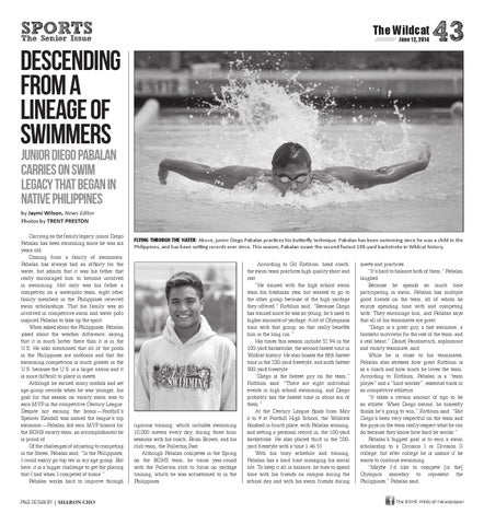 meets and practices. “It’s hard to balance both of them,” Pabalan laughed. Because he spends so much time participating in swim, Pabalan has multiple good friends on the team, all of whom he enjoys spending time with and competing with. They encourage him, and Pabalan says that all of his teammates are great. “Diego is a great guy, a fast swimmer, a fantastic motivator for the rest of the team, and a real beaut,” Daniel Parahnevich, sophomore and varsity teammate, said. While he is close to his teammates, Pabalan also stresses how great Rotblum is as a coach and how much he loves the team. According to Rotblum, Pabalan is a “team player” and a “hard worker”, essential traits in an competitive athletics. “It takes a certain amount of ego to be an athlete. When Diego swims, he honestly thinks he’s going to win,” Rotblum said. “But Diego’s been very respectful on the team and the guys on the team really respect what he can do because they know how hard he works.” Pabalan’s biggest goal is to earn a swim scholarship to a Division I or Division II college, but after college he is unsure if he wants to continue swimming. “Maybe I’d like to compete [in the] Olympics someday to represent the Philippines,” Pabalan said. The BOHS Wildcat Newspaper