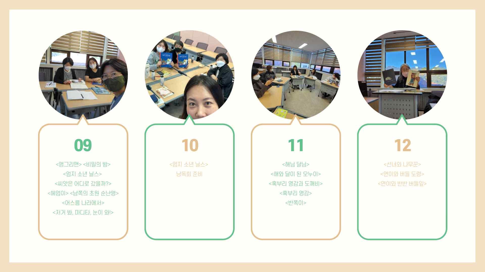 올해의금요일은교육부다.김혜련,박은경,박은주,서윤경,윤희경,이민하, 정영예,정혜숙,한경선그리고2021년에북클럽에서모집된신입회원김은지, 이정순,장서윤이렇게많은인원이함께출발을했다역시인원이많으면무 엇을하든재미나다신구의조화로운토론속에서서로를알아감에감사하고