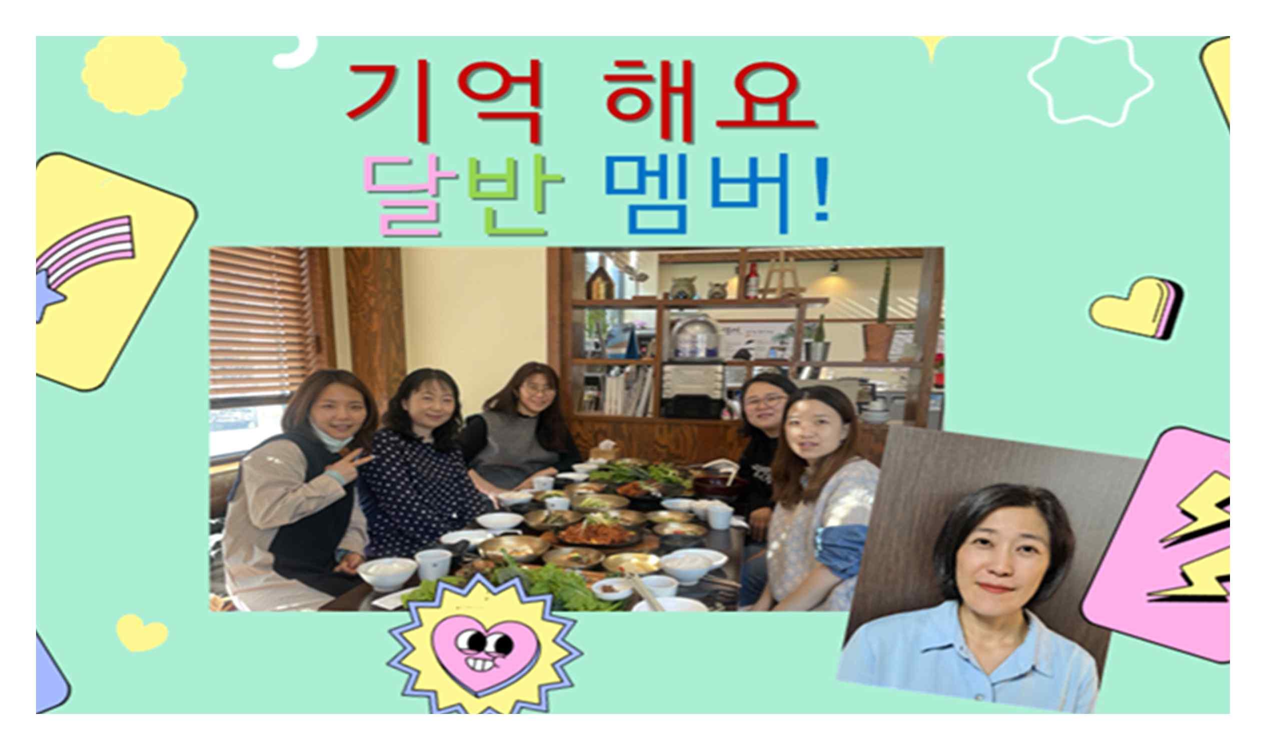 2022년달반은김수정,박정희,양정문,엄시내,이은주,최지연6명이함께 모임을했습니다.