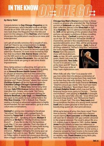 by Harry Taint Congratulations to Gay Chicago Magazine on its 35th anniversary, which decided to do as all folks should do on their 35th and got a make-over. The new look drops the Magazine from the title and puts it in the category of the Red Eye, which better showcases the publication’s new focus on news and entertainment. Let’s get all socially conscious for a couple of secs, shall we? Have to say congratulations to James Cappleman who defeated Molly Phelan in 46th Ward, giving the City Council its second openly gay alderman. However, I’m even more excited by that fact that incumbent Ald. Bernie Stone (who has run the 50th ward as his own little fiefdom) was upset at the polls by Debra Silverstein. You can bet that both those wards are going to see some drastic improvements. Wow, being serious is exhausting, let’s get on to the dish. There’s some major housecleaning going on at Howard Brown Health Center (HBHC). It’s all part of restoring the trust the community had in HBHC and comes none too soon, with the clinic’s annual fundraiser coming in May… Fashion designer and “Project Runway” season four winner Christian Siriano will be the featured guest for Columbia College Chicago’s Conversation in the Arts on Apr. 25. Nena Ivon, former long-time Chicago Saks Fifth Avenue fashion director, will interview him. Siriano, who made “Hot Tranny Mess” a catch phrase, has designed clothing for Victoria Beckham, Lady Gaga, and Heidi Klum. The open to the public lecture will be held in the Film Row Cinema, 1104 S. Wabash Ave. Theater seating is limited so advanced registration is highly recommended. For seat reservations, go to at www. colum.edu/conversations. Halsted’s is giving new meaning to the phrase “He is Risen” this Easter with a gospel brunch hosted by Tajma Hall. It will be more like, “He is raising the roof!”…Speaking of Easter, Madam X performs at Kit Kat for “The Big Divalicious Easter Brunch.” . . .If you like to slip it in the backdoor, mark May 27 on your calendar. That’s the date of The Ram’s “Shameless” party. It’s being held during IML weekend and everyone must use the rear entrance…Parlour is bringing the young guys up to Rogers Park with its new “BoyBar” dance party on Friday nights. It seems hot young guys dancing draw a bigger crowd than drag queens. Imagine!?!?!
