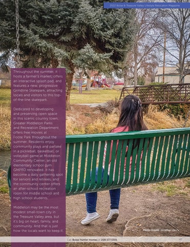 Throughout the summer, it hosts a farmer’s market, offers an interactive splash pad, and features a new, progressive Grindline Skatepark, attracting locals and visitors to this topof-the-line skatepark. Dedicated to developing and preserving open space in this scenic country town, Greater Middleton Parks and Recreation Department offers free movies at Foote Park throughout the summer. Residents enjoy community plays and partake in a pickleball, basketball, or volleyball game at Middleton Community Center, an old elementary school gym GMPRD renovated. It has become a daily gathering spot for seniors and retirees, and the community center offers an after-school recreation room for middle school and high school students. Middleton may be the most modest small-town city in the Treasure Valley area, but it’s big on heart, family, and community. And that is just how the locals want to keep it.