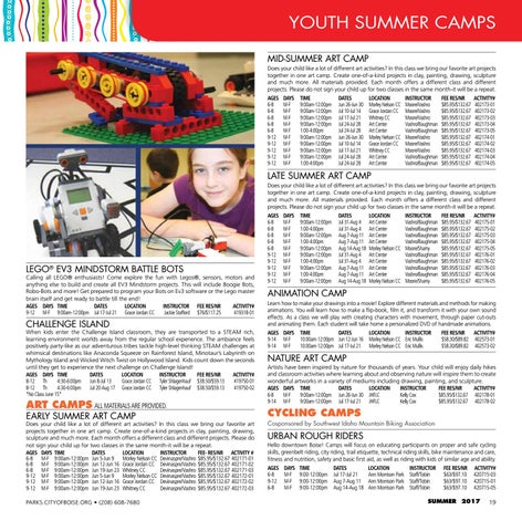 URBAN ROUGH RIDERS Hello downtown Boise! Camps will focus on educating participants on proper and safe cycling skills, greenbelt riding, city riding, trail etiquette, technical riding skills, bike maintenance and care, fitness and nutrition, safety and basic first aid, as well as riding with kids of similar age and ability. AGES DAYS TIME DATES LOCATION INSTRUCTOR FEE RES/NR ACTIVITY# 6-8 M-F 9:00-12:00pm Jul 17-Jul 21 Ann Morrison Park Staff/Tobin $63/$97.10 420715-03 9-12 M-F 9:00-12:00pm Aug 7-Aug 11 Ann Morrison Park Staff/Tobin $63/$97.10 420715-01 6-8 M-F 9:00-12:00pm Aug 14-Aug 18 Ann Morrison Park Staff/Tobin $63/$97.10 420715-05 SUMMER 2017