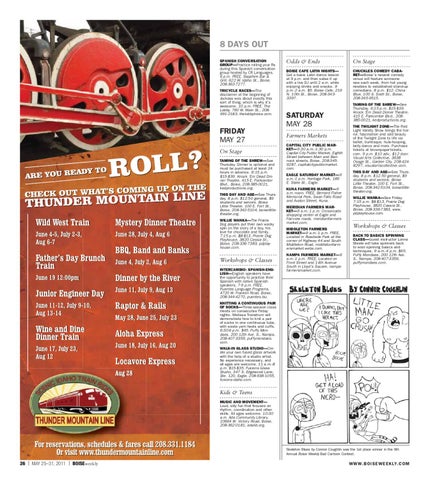 SATURDAY MAY 28 Farmers Markets CAPITAL CITY PUBLIC MARKET—9:30 a.m.-1:30 p.m. Capital City Public Market, Eighth Street between Main and Bannock streets, Boise, 208-3459287, capitalcitypublicmarket. com. EAGLE SATURDAY MARKET—9 a.m.-1 p.m. Heritage Park, 185 E. State St., Eagle. KUNA FARMERS MARKET—9 a.m.-noon. FREE. Bernard Fisher Memorial Park, Swan Falls Road and Avalon Street, Kuna. MERIDIAN FARMERS MARKET—9 a.m.-1 p.m. Crossroads shopping center at Eagle and Fairview roads. meridianfarmersmarket.com. MIDDLETON FARMERS MARKET—9 a.m.-1 p.m. FREE, Located in Roadside Park at the corner of Highway 44 and South Middleton Road, middletonfarmersmarket.webs.com. NAMPA FARMERS MARKET—9 a.m.-1 p.m. FREE, Located on Front Street and 14th Avenue South in Lloyd’s Square, nampafarmersmarket.com.