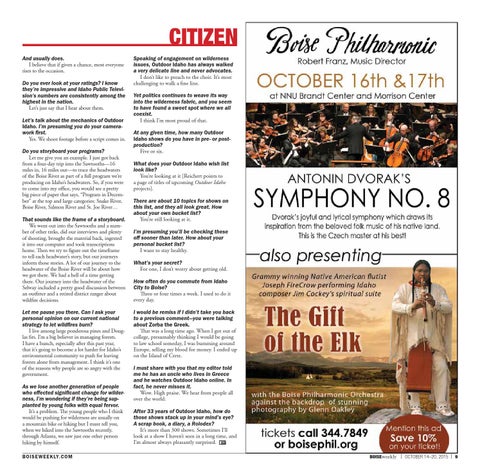CITIZEN And usually does. I believe that if given a chance, most everyone rises to the occasion. Do you ever look at your ratings? I know they’re impressive and Idaho Public Television’s numbers are consistently among the highest in the nation. Let’s just say that I hear about them. Let’s talk about the mechanics of Outdoor Idaho. I’m presuming you do your camerawork first. Yes. We shoot footage before a script comes in. Do you storyboard your programs? Let me give you an example. I just got back from a four-day trip into the Sawtooths—16 miles in, 16 miles out—to trace the headwaters of the Boise River as part of a full program we’re producing on Idaho’s headwaters. So, if you were to come into my office, you would see a pretty big piece of paper that says, “Program in December” at the top and large categories: Snake River, Boise River, Salmon River and St. Joe River… That sounds like the frame of a storyboard. We went out into the Sawtooths and a number of other treks, did our interviews and plenty of shooting, brought the material back, ingested it into our computer and took transcriptions home. Then we try to figure out the timeframe to tell each headwater’s story, but our journeys inform those stories. A lot of our journey to the headwater of the Boise River will be about how we got there. We had a hell of a time getting there. Our journey into the headwater of the Selway included a pretty good discussion between an outfitter and a retired district ranger about wildfire decisions. Let me pause you there. Can I ask your personal opinion on our current national strategy to let wildfires burn? I live among large ponderosa pines and Douglas firs. I’m a big believer in managing forests. I have a hunch, especially after this past year, that it’s going to become a lot harder for Idaho’s environmental community to push for leaving forests alone from management. I think it’s one of the reasons why people are so angry with the government. As we lose another generation of people who effected significant change for wilderness, I’m wondering if they’re being supplanted by young folks with equal fervor. It’s a problem. The young people who I think would be pushing for wilderness are usually on a mountain bike or hiking but I must tell you, when we hiked into the Sawtooths recently, through Atlanta, we saw just one other person hiking by himself. BOISE WEEKLY.COM