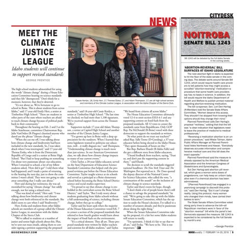 Idaho students will continue to support revised standards GEORGE PRENTICE The high school students admonished for using the words “climate change” during a House Education Committee hearing on science standards said they felt “disrespected.” Don’t think for a moment, however, that they’re deterred. “It’s not about us. We’re fortunate to go to school in Boise. This is about students from across Idaho,” said 17-year-old Emily Herr, a senior at Timberline High School. “There are students in other parts of the state where teachers are afraid to teach climate change because of political pushback in their community.” Throughout the hearing on Feb. 2 and 3 at the Idaho Statehouse, committee Chairwoman Rep. Julie VanOrden (R-Pingree) chastised anyone who dared use the phrase “climate change.” “When she cut me off, I was talking about how climate change and biodiversity had been included in the new standards. So, I was taken aback when I was interrupted,” said 17-year-old Therese Etoka, who is from the Democratic Republic of Congo and is a senior at Boise High School. “But I had to keep pushing on something I’m about very passionate about: our education. When I returned to school, a lot of my fellow students asked, ‘How did it go?’ I told them what had happened, and I made a point of returning to the hearing the next day, just to show the committee I wasn’t afraid. They were not going to take away something that I really care about.” Herr said during her testimony, she was admonished for saying “climate change” but oddly enough, not for using a related term. “That was kind of weird,” Herr said. “I was talking about how biodiversity and climate change were both referenced in the standards. She didn’t seem to care when I said ‘biodiversity.’” Herr, Etoka and students from other Idaho schools are members of a group called the Climate Justice League, in association with the Idaho Chapter of the Sierra Club. “We’ve talked to students at a number of junior and senior high schools about this. Plus, we’ve sent out mass emails, asking them to consider signing a petition supporting the proposed B OI S E WEEKLY.C O M
