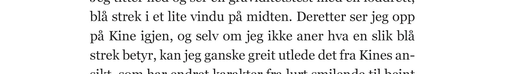 «Er du helt utafor?» sier Kine. Hun fortsetter: «Jeg våknetavatnoesildretnedoverlåret, ogreiste megfor åskrupålyset. Jegtrorvannetgikk.»