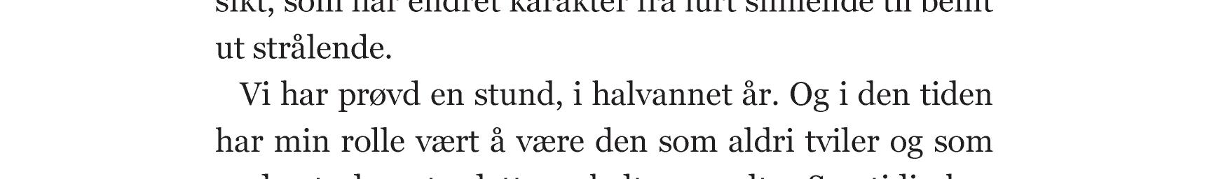 En lørdag morgen i februar går jeg ned trappen til stua, der Kine har tatt plass i det ene hjørnet av sofaenmedenbokpåfangetogenkopptebalanserende faretruende på armlenet. Det snør utenfor vinduet. Snøenleggersegpåaltjegkanse idenlillekvadranten som er tilgjengelig for øyet i vårt vinduut mot verden. Snøen leggerseg sometteppe, slik at gjenstandene ser høyere ut enn hva de er. Den draperer gelendrene på balkongene, den sørgmodige sittebenken i bakgården og huskestativet som har frosset i kjettingleddene og strekker seg stivt mot bakken. Snøen er også i luften, der den laver ned i store flak og legger seg oppå gårsdagenssnø.