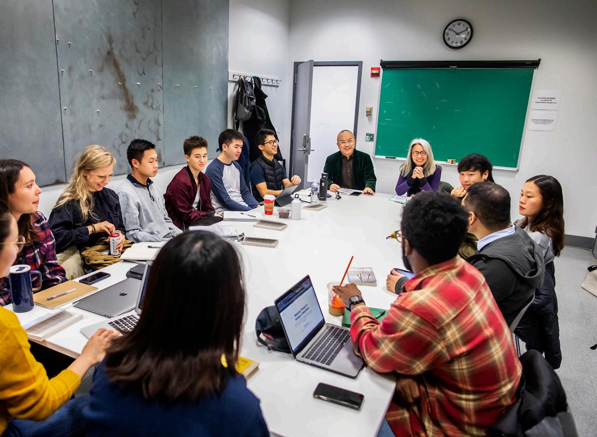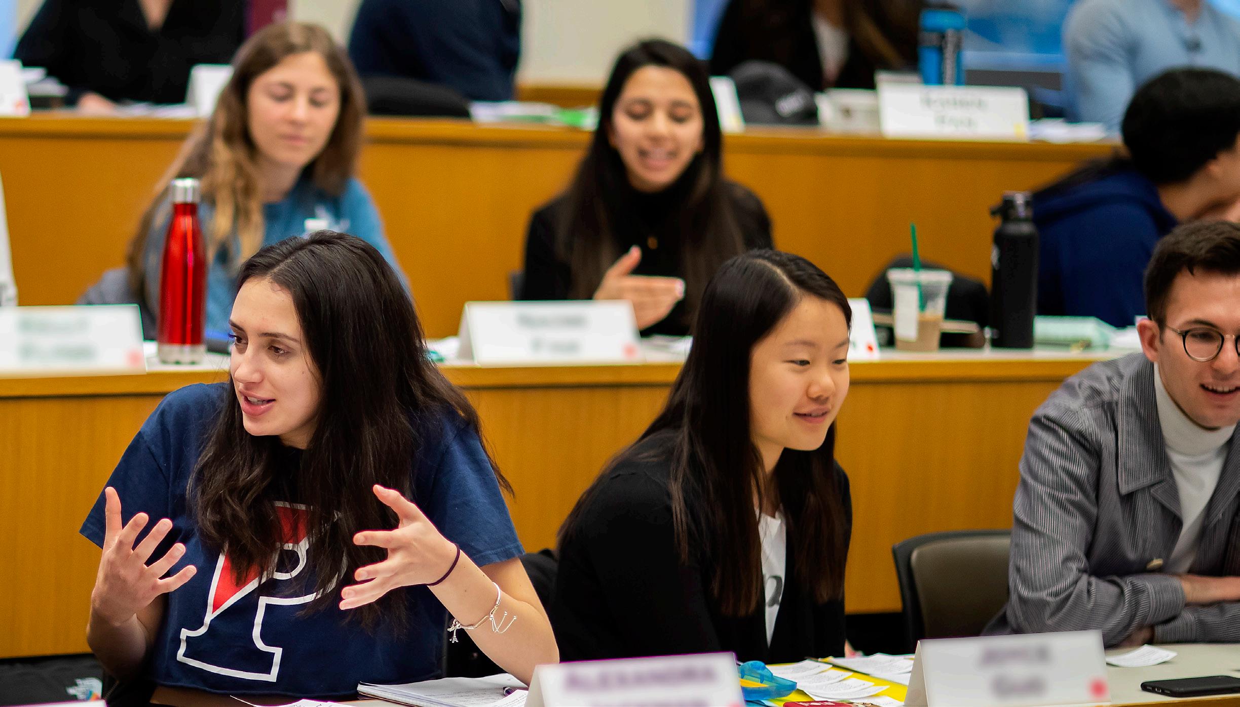 ▲ Students discuss achieving personal, long-term goals in Dr. Angela Duckworth's Grit Lab, one of the inaugural SNF Paideia courses last spring.
