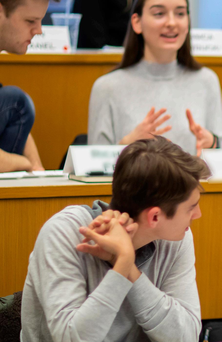 ◄ Students engage in a roundtable discussion during a spring 2019 SNF Paideia course.