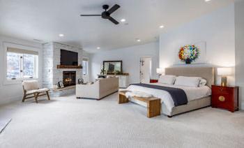 The grand picturesque foyer opens to the large open floor plan connecting its modern kitchen. It has a whimsical hidden walk-in pantry, a spacious dining room, and a central living room to gather family or entertain. Three ensuite bedrooms, a laundry room, and a double glass-doored office finish off the living quarters of the first floor. Up the stairs are an open flex space perfect for movies and games, two bedrooms for guests or office space, and an extra sizeable primary bedroom. It includes a fireplace with mounted TV and sitting area, a built-in wet bar, beverage refrigerator, oversized walk-in closet with island and washer and dryer, large bathroom with dual vanity, luxurious three-head walk-in shower, and a jet soaking tub.