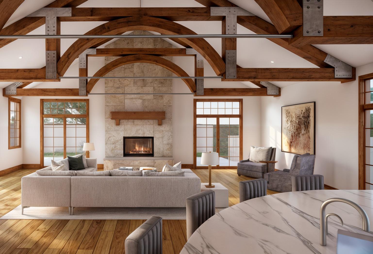 The inviting great room boasts an open floor plan featuring a grand stone fireplace and a wood beam ceiling with iron braces. Five large windows flood the space with natural light and offer breathtaking views of the valley. The great room seamlessly connects to the dining area and the bespoke chef’s kitchen, which has been completely renovated with high-end appliances, custom cabinetry, and gorgeous natural stone.