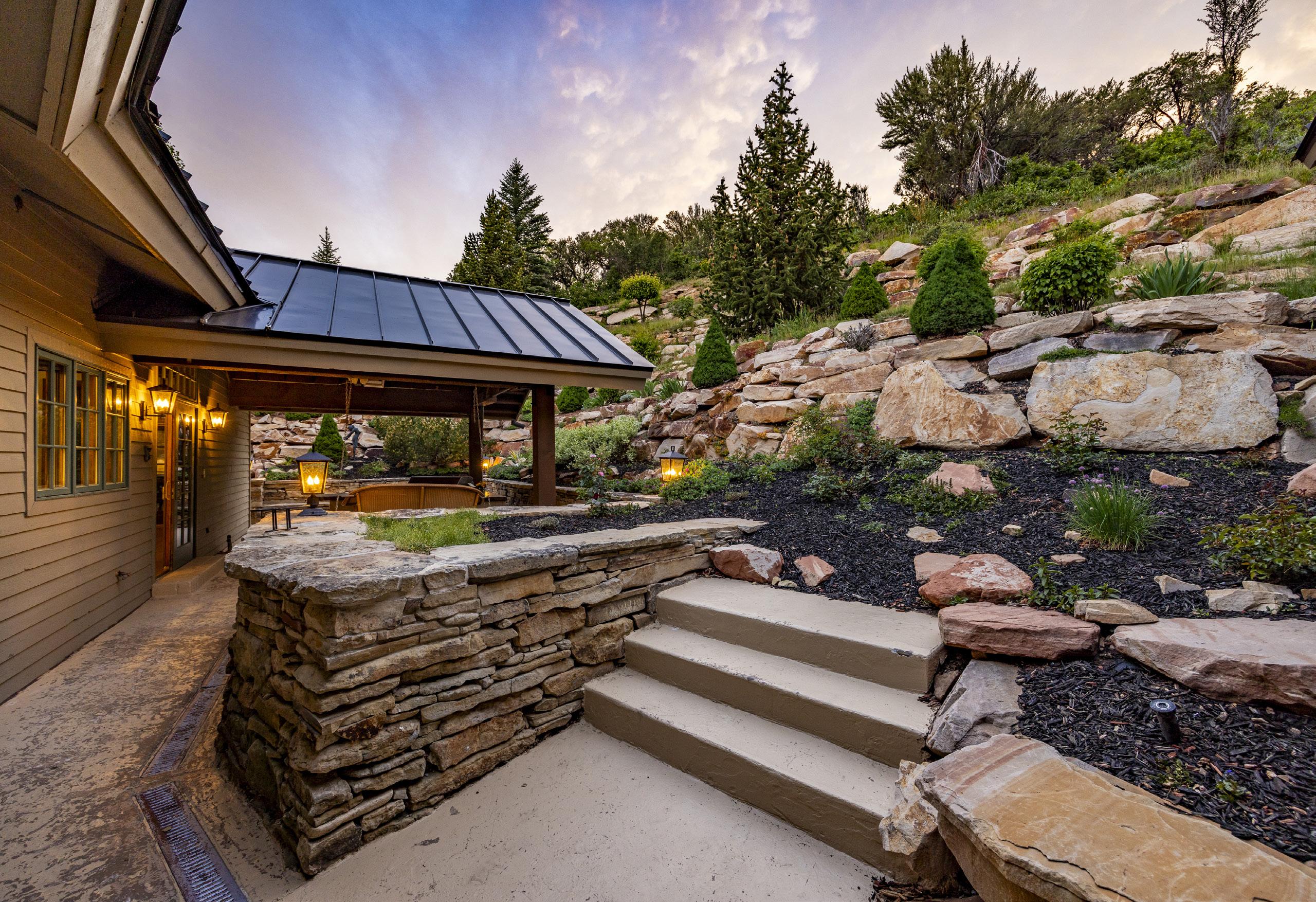 The home at 4810 Bear View Drive is enhanced by a wrap - around patio adorned with beautiful tiered gardens, an outdoor kitchen seamlessly connected to the main kitchen, a hot tub deck, and ample space for outdoor lounging and dining. This inviting patio is ideal for entertaining family and friends, or simply relaxing with a good book and enjoying Park City’s delightful summer weather.