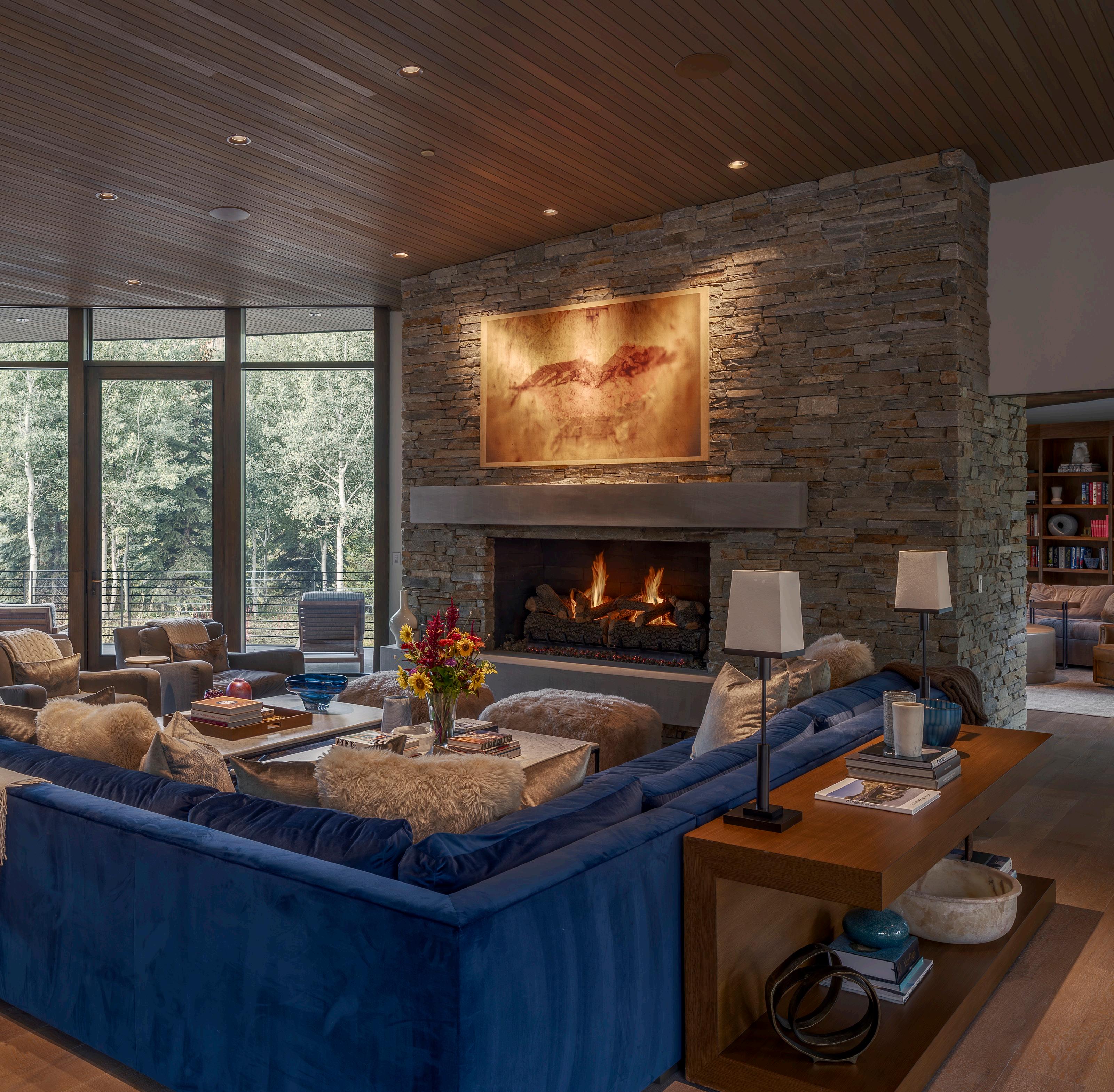 Completing the main level is a sophisticated library / office, wrapped in rich custom millwork and designed for both quiet reflection and inspired work-from-home moments. A bar and multiple indoor and outdoor fireplaces add warmth and ambiance throughout, blurring the lines between indoor elegance and outdoor adventure.
