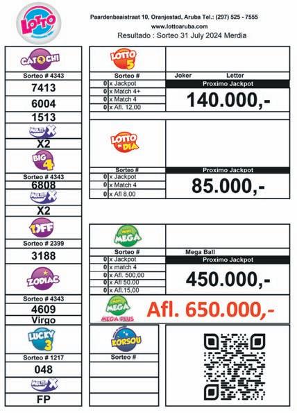 di Dia, Lotto 5, Mini Mega y cu su Mega Plus y e diferente weganan di Raspa y Gana y Instacash. Cumprando Lotto bo ta contribui na deporte riba nos isla. E meta ta pa organisa loteria, cambia bida di su hungadonan y na mes momento inverti den deporte local pa medio di donacionnan na e comision di subsidio.