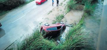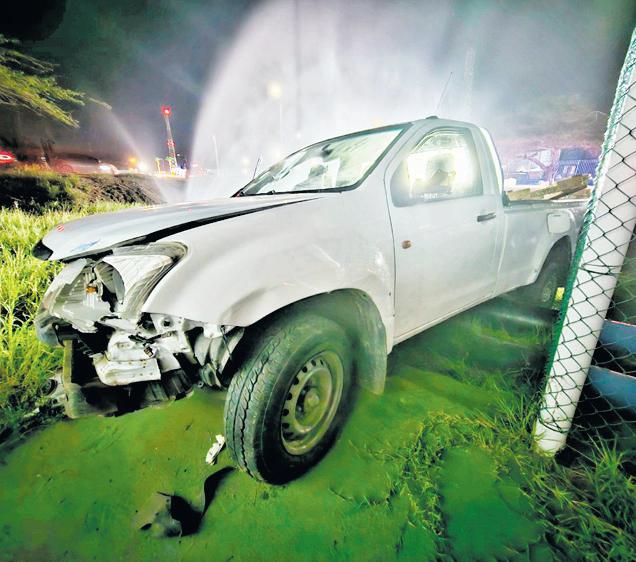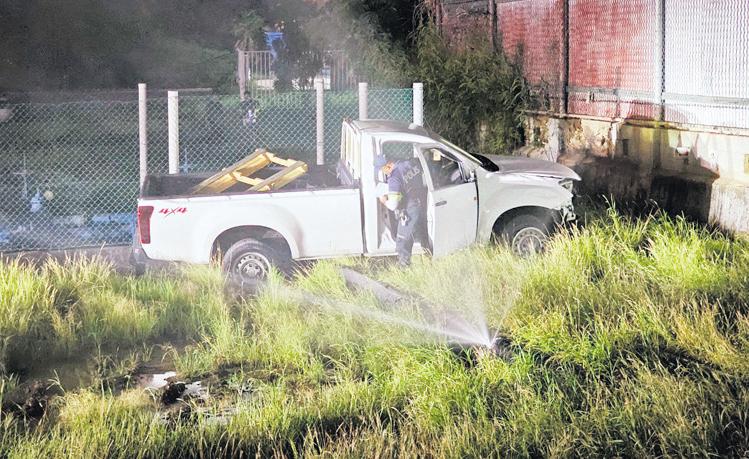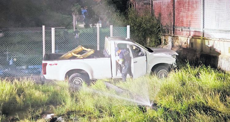 Un chauffeur na stuur di un Isuzu pickup color blanco biniendo di pariba a yega e t-kruising dilanti WEB; pero a subi e isla memey. E ta ranca un borchi di trafico, y sigui drenta un pida mondi y a bay dal contra un tubo di awa di WEB.