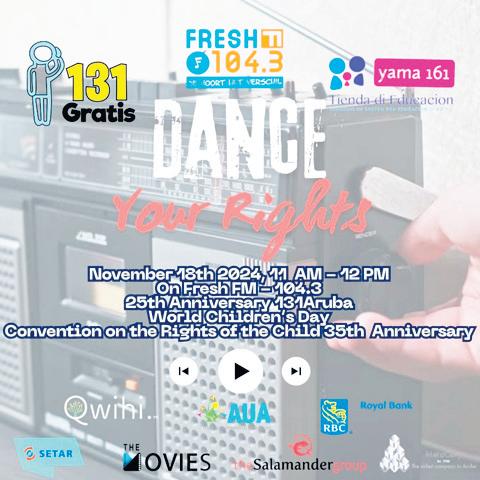 131 conhuntamente cu Fresh FM ta organisando Dance Your Rights ariba dialuna 18 di movember di 11or di mainta te cu 12or di merdia. Musica semper tin un mensahe incorpora den dje. Durante Dance Your Rights, pa medio di musica lo elabora ariba diferente derecho di mucha. E locutora Angela Tiemens conhuntamente cu 131 y Tienda di Educacion lo ta deleitando e oyente cu musica den cual tin mensahenan di derecho di mucha, y lo ta elaborando extenso ariba e derechonan aki.